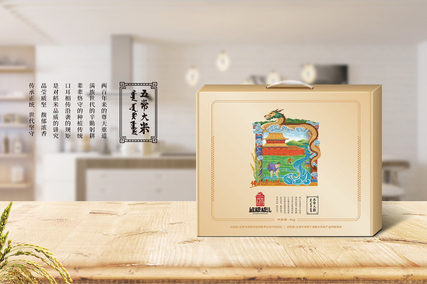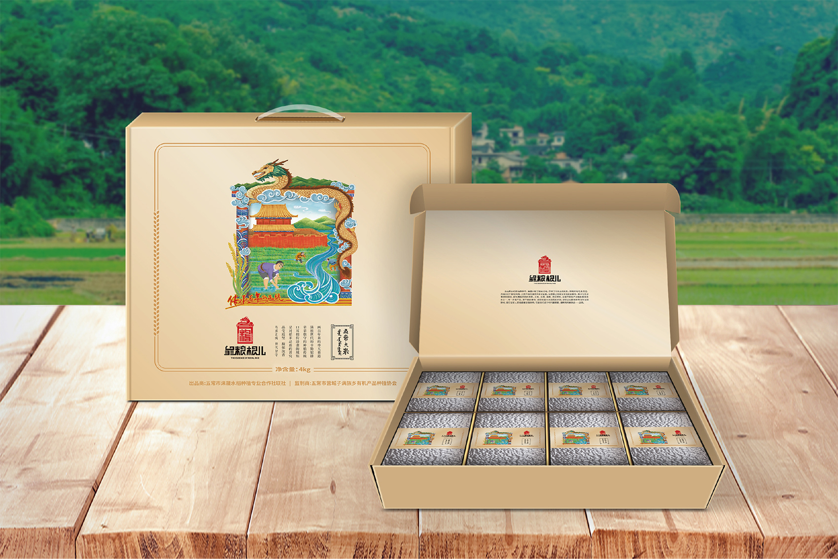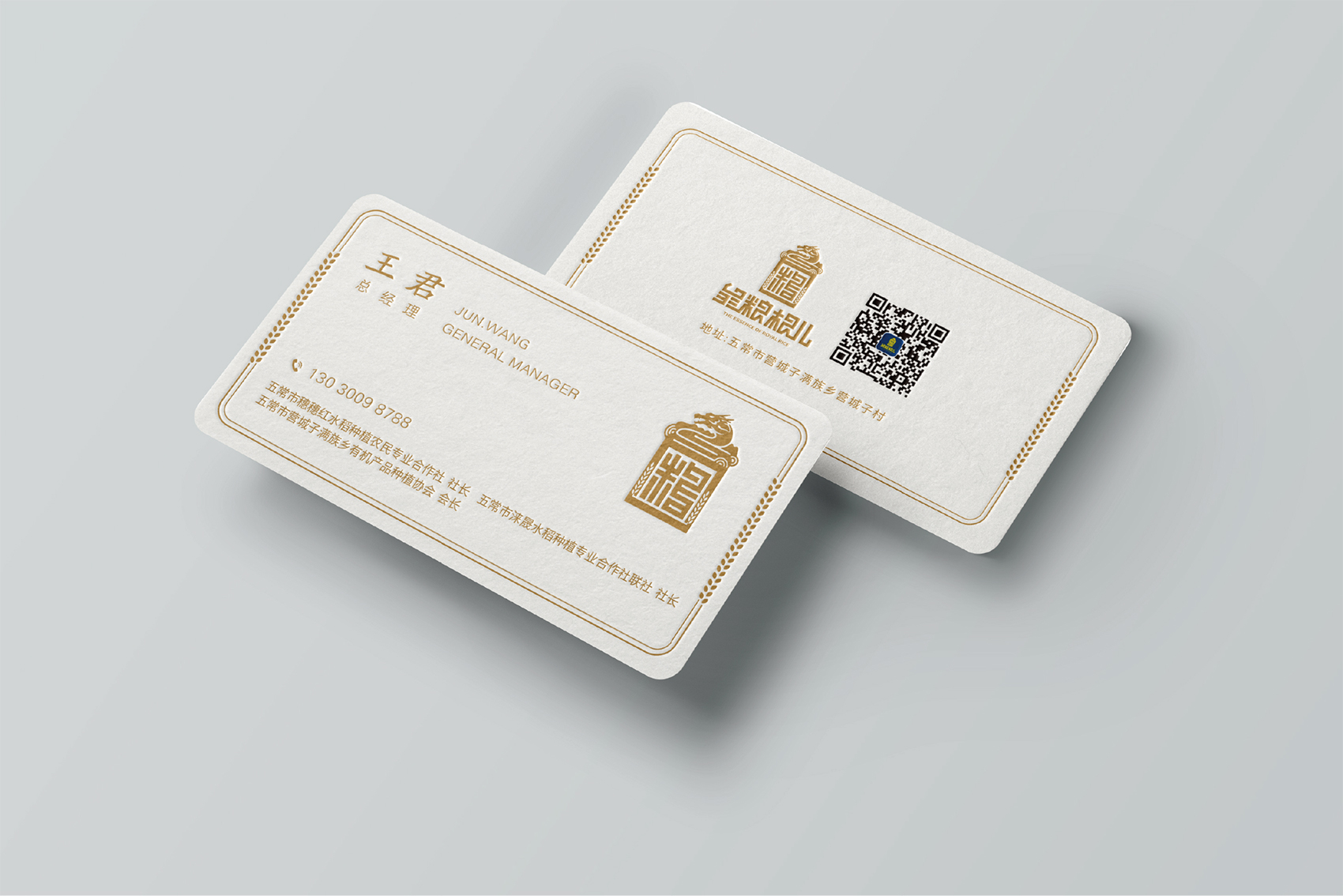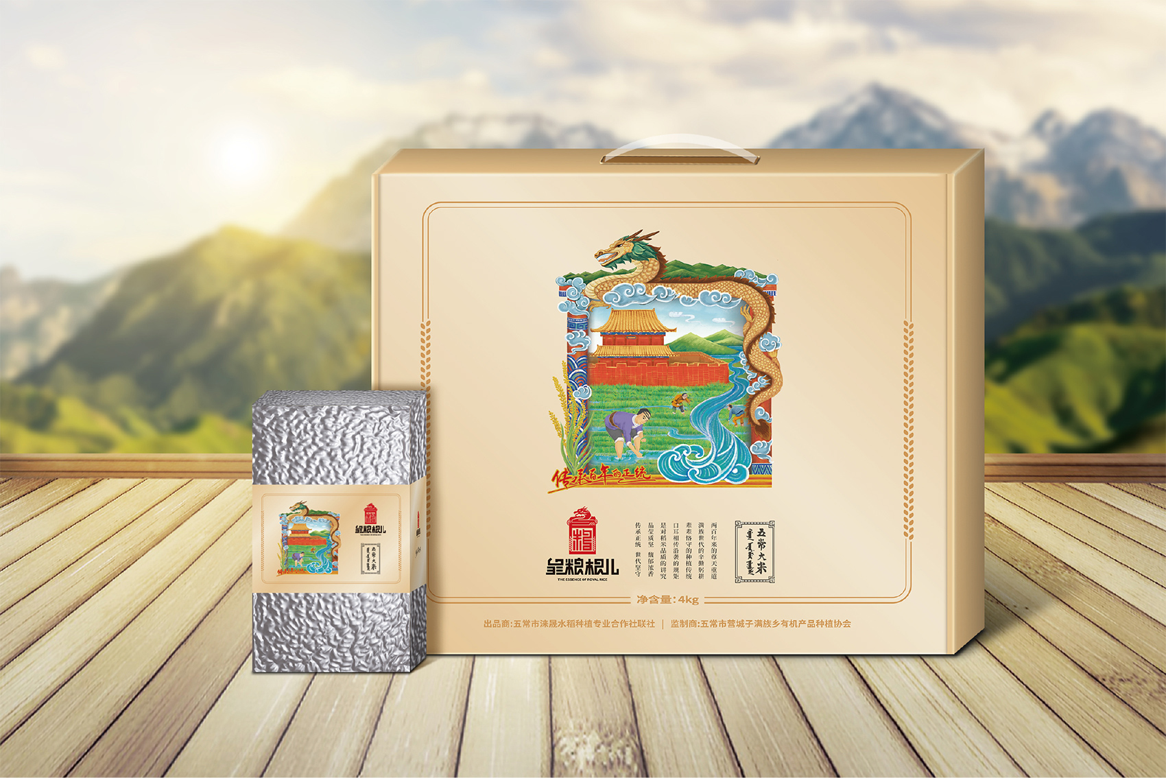以兼顧理解與傳播度的slogan——傳承百年的正統成為了皇糧根兒不斷堅守與傳承的最好注解。皇糧根兒大米的logo采用了玉璽的形象來傳遞200年的皇室貢米內涵,其中的環繞其中的白山黑水象征著滿族的龍興之地,原創設計字體采用了乾隆年間玉璽篆字字體風格,將皇糧根三字都融為一體,整體可以視作“糧”字,配合兩旁的水稻紋樣點明了行業屬性,端莊大氣,頗具皇家風范,在具有設計感的同時,能夠將皇糧根=正統貢米的品牌印象植入消費者心智。