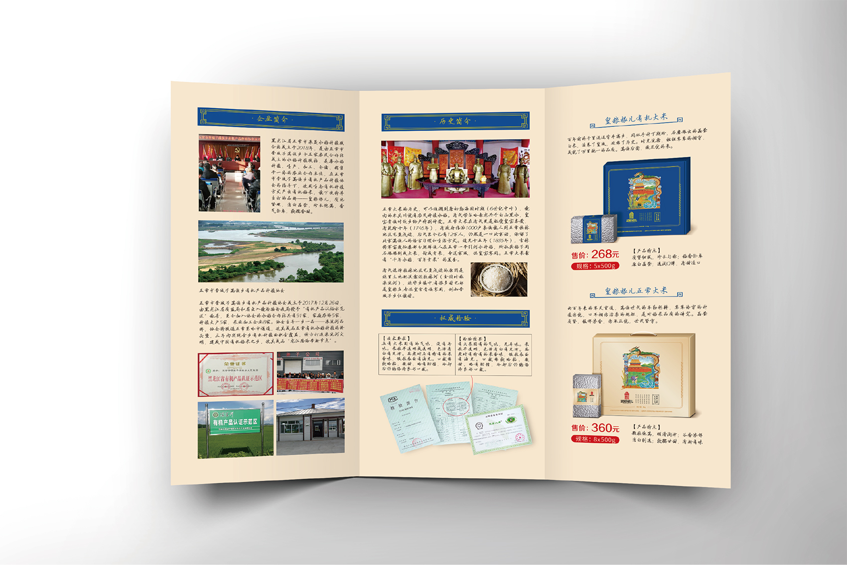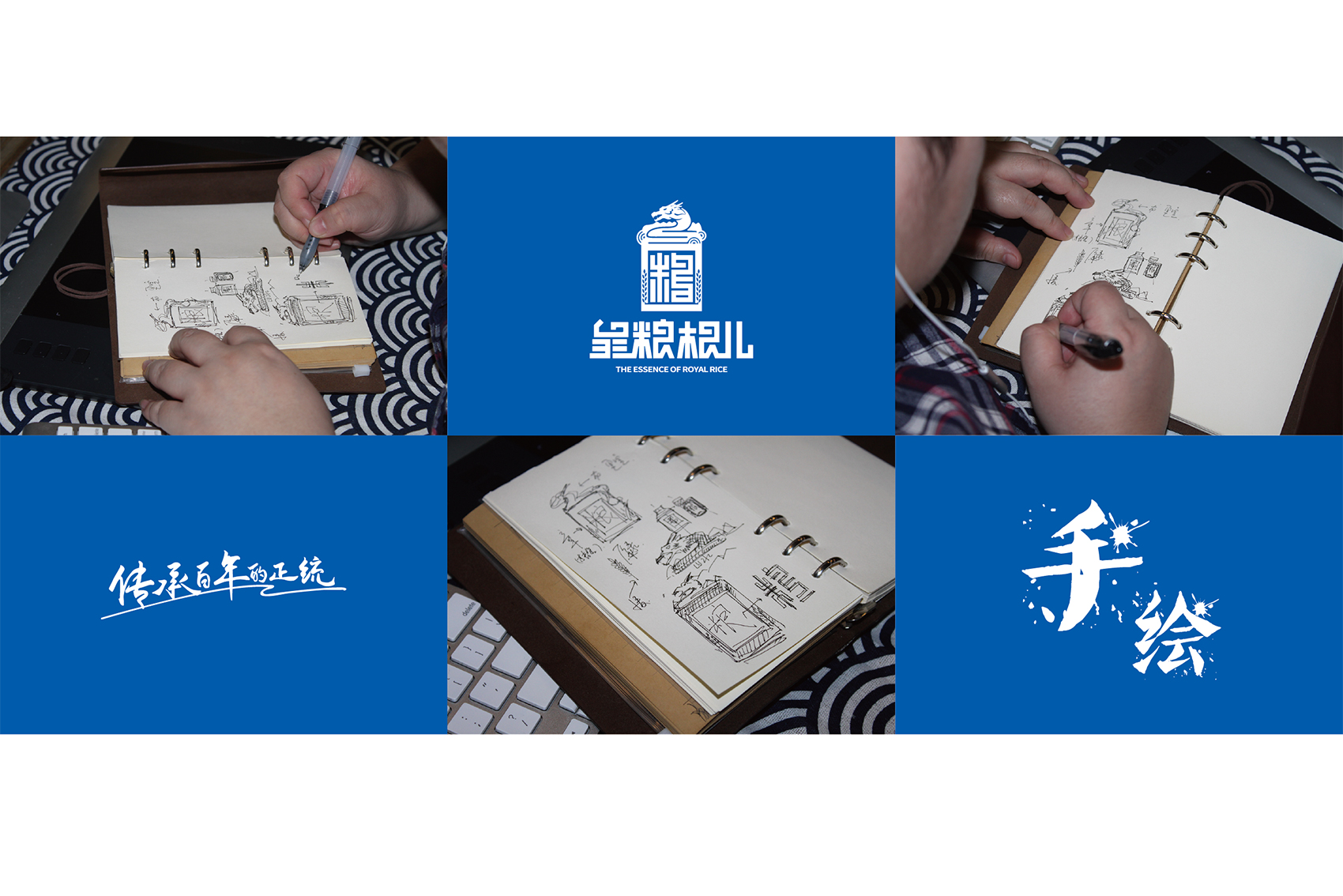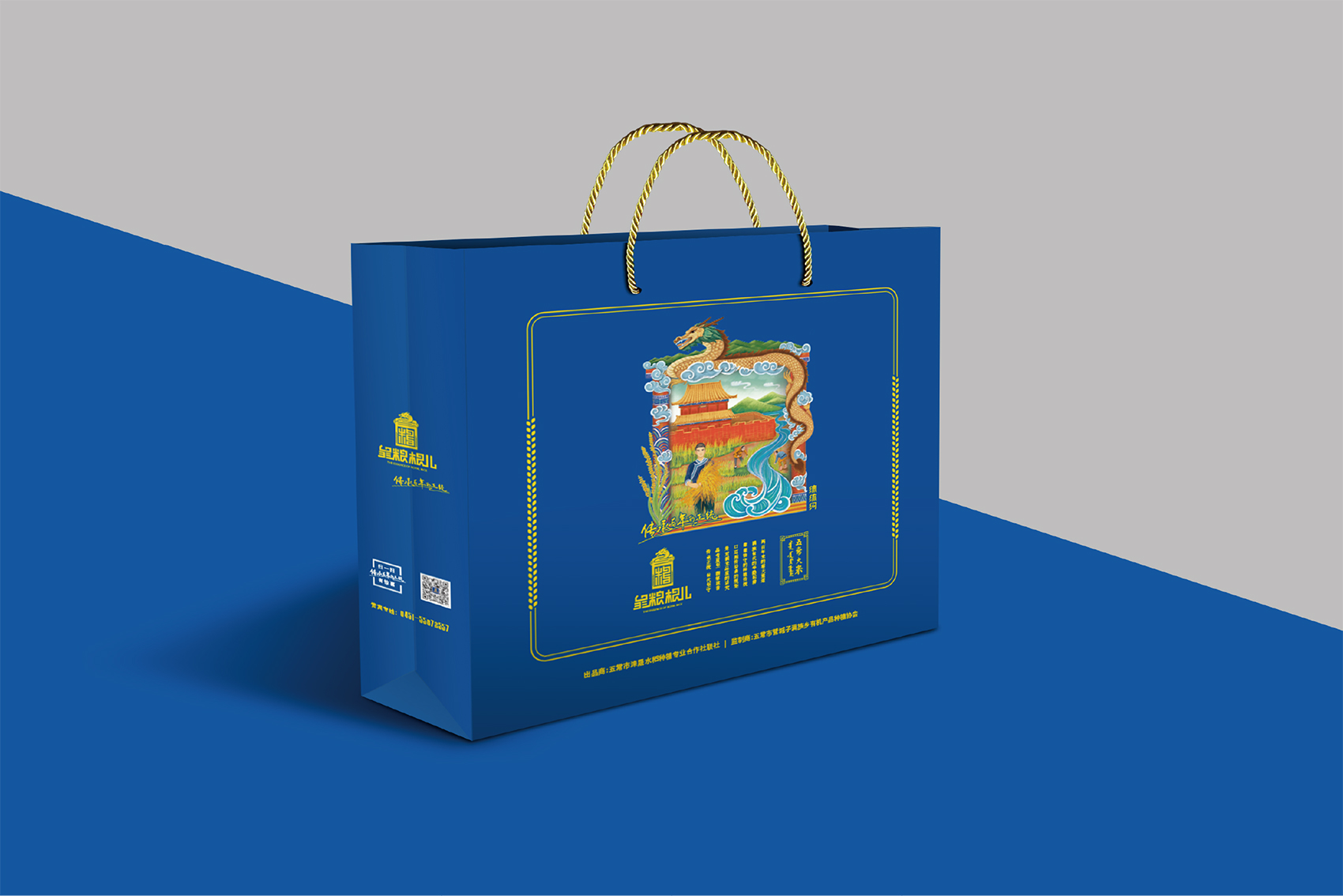 針對皇糧根兒大米中的高端產品——有機大米,繽策團隊在進行市場調研,查閱大量資料后發現電商市場中有機產品包裝多數以紅色與綠色為主,紅色對于中國民族具有獨有的心理印記,代表著吉祥喜慶,節日的歡樂,綠色則代表自然與生態,在視覺層面上大多數都趨于同化,無法留下獨特的品牌印象。在確定品牌文化后,在延續傳承滿族百年正統貢米的主題下,繽策團隊在如何表現滿族傳統方面進行了大量的資料收集整理與研究,發現代表滿族皇室的顏色正是有機大米品類中幾乎沒有的藍色,這種差異化的顏色本身就能夠起到超級符號的作用;在內容方面則選取了與品牌logo相同結構的龍與皇城組合而成的元素,一方面呼應logo,另一方面不斷加強皇糧根兒的品牌印象,形成聯動效應。