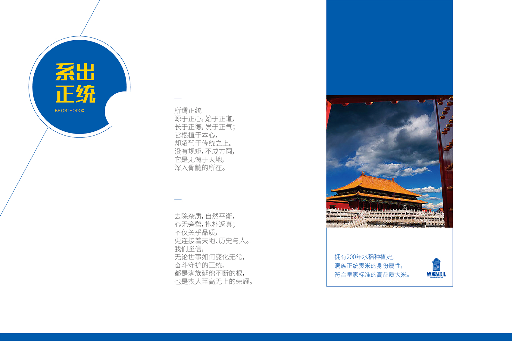 作為品牌的核心競爭力,品牌文化需要彰顯產品自身的特點和與眾不同的差異化存在,結合創始人的發心與愿景,創造出具有獨特價值的文化系統。繽策團隊在與企業座談中了解到五常市營城子滿族鄉自唐興起,清代正始,歷經200個春夏秋冬,世代種植貢米的悠久歷史,是品牌所具備的獨一無二的天然優勢,同時也是產品品質值得信賴的根源所在。這使得皇糧根兒有機大米采用滿族傳統種植方式,進行有機種植,杜絕農藥化肥,傳統的生物除蟲人工除草,精耕細作保證產品品質。這也成為了皇糧根兒品牌文化的出發點與落腳點。