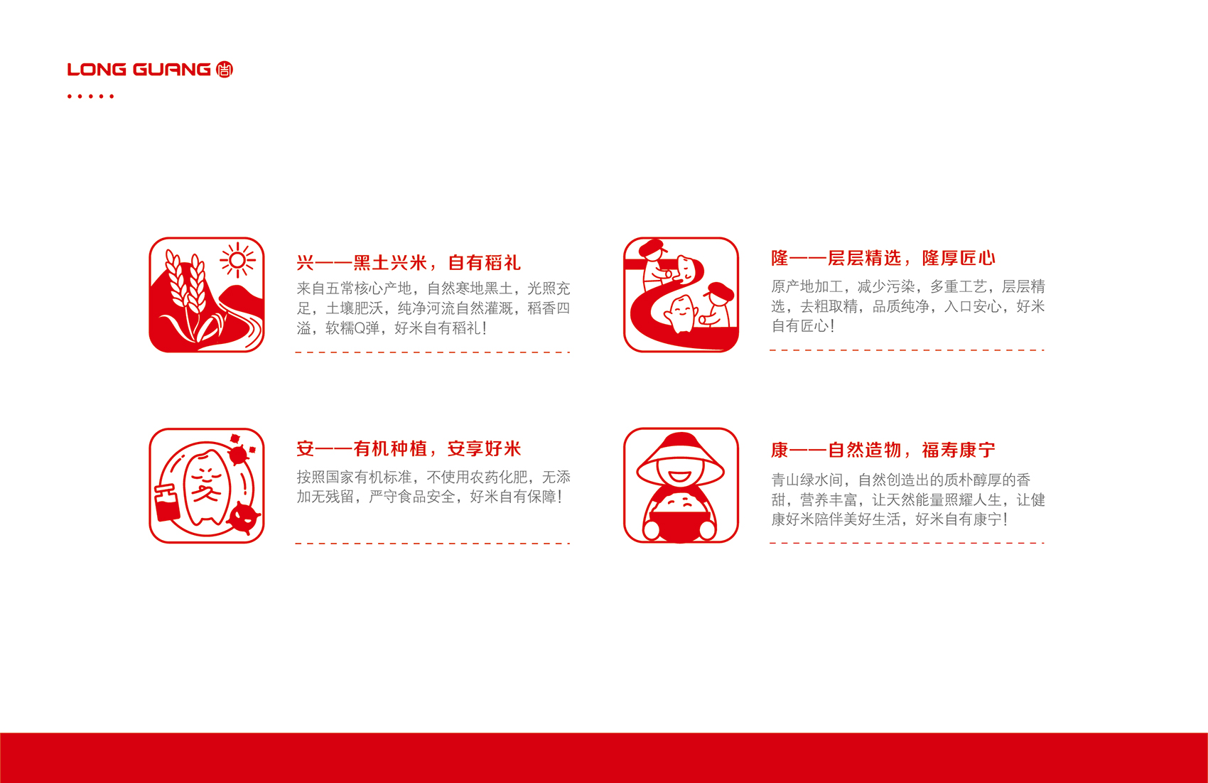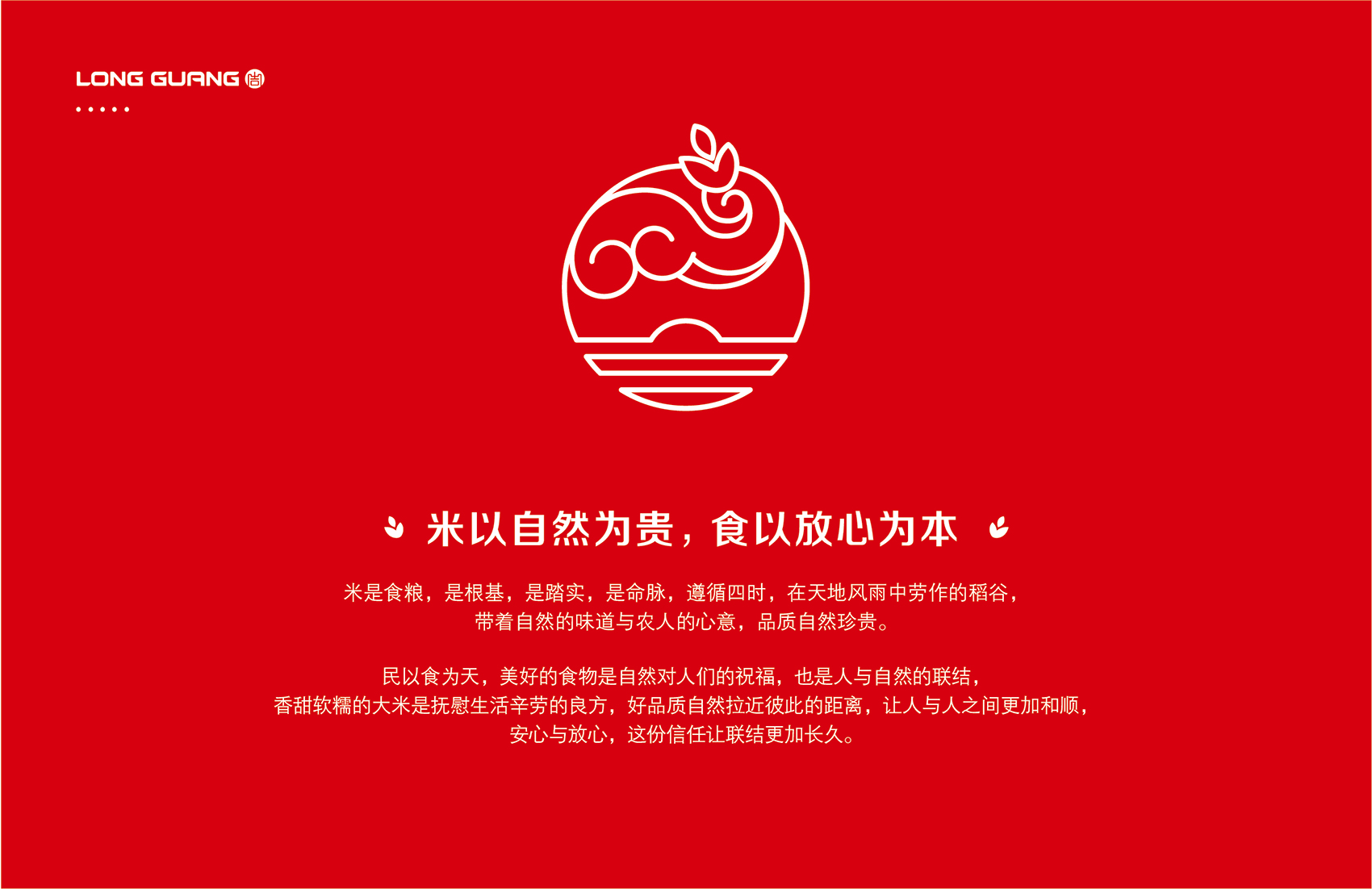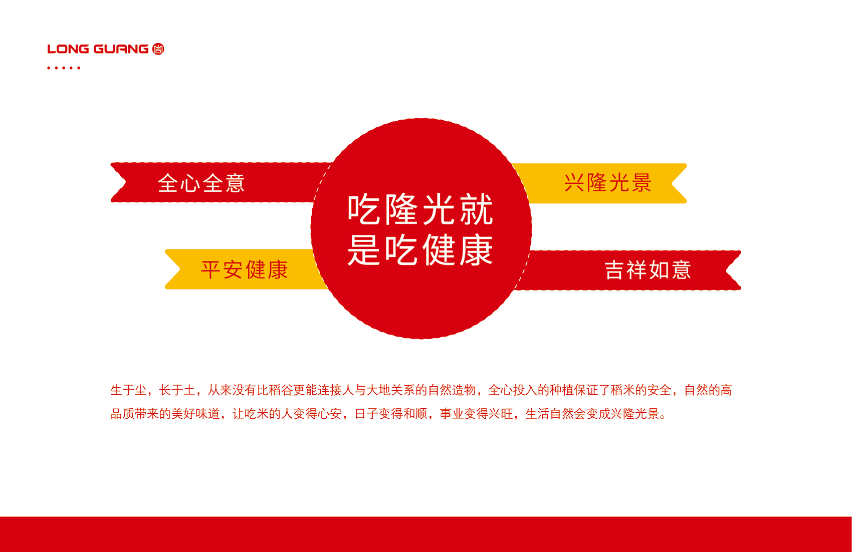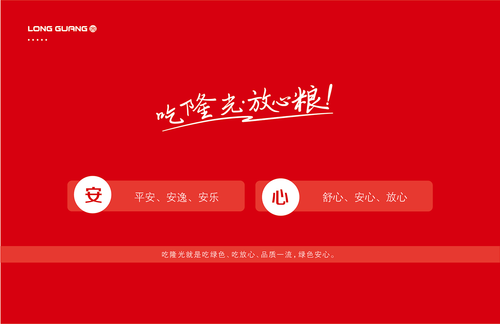 品牌文化從隆光=放心為出發(fā)點(diǎn),以品牌定位為核心,逐層遞進(jìn)不斷詮釋隆光大米=放心糧的品牌占位,總結(jié)出吃隆光,放心糧的slogan,并歸納出“興隆光景、吉祥如意、全心全意、平安健康”四個(gè)品牌核心價(jià)值,將企業(yè)的匠心精神與產(chǎn)品品質(zhì)進(jìn)行了梳理論證,全方位闡釋隆光大米的高品質(zhì),打造與同類市場(chǎng)相區(qū)隔的品牌印象。