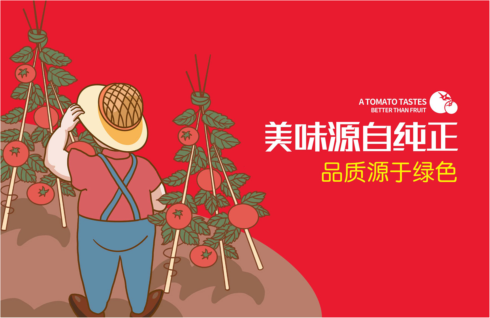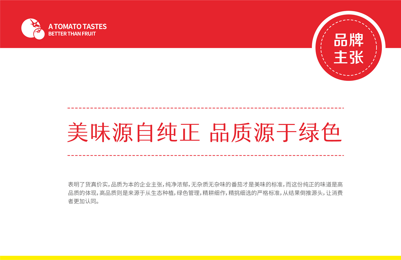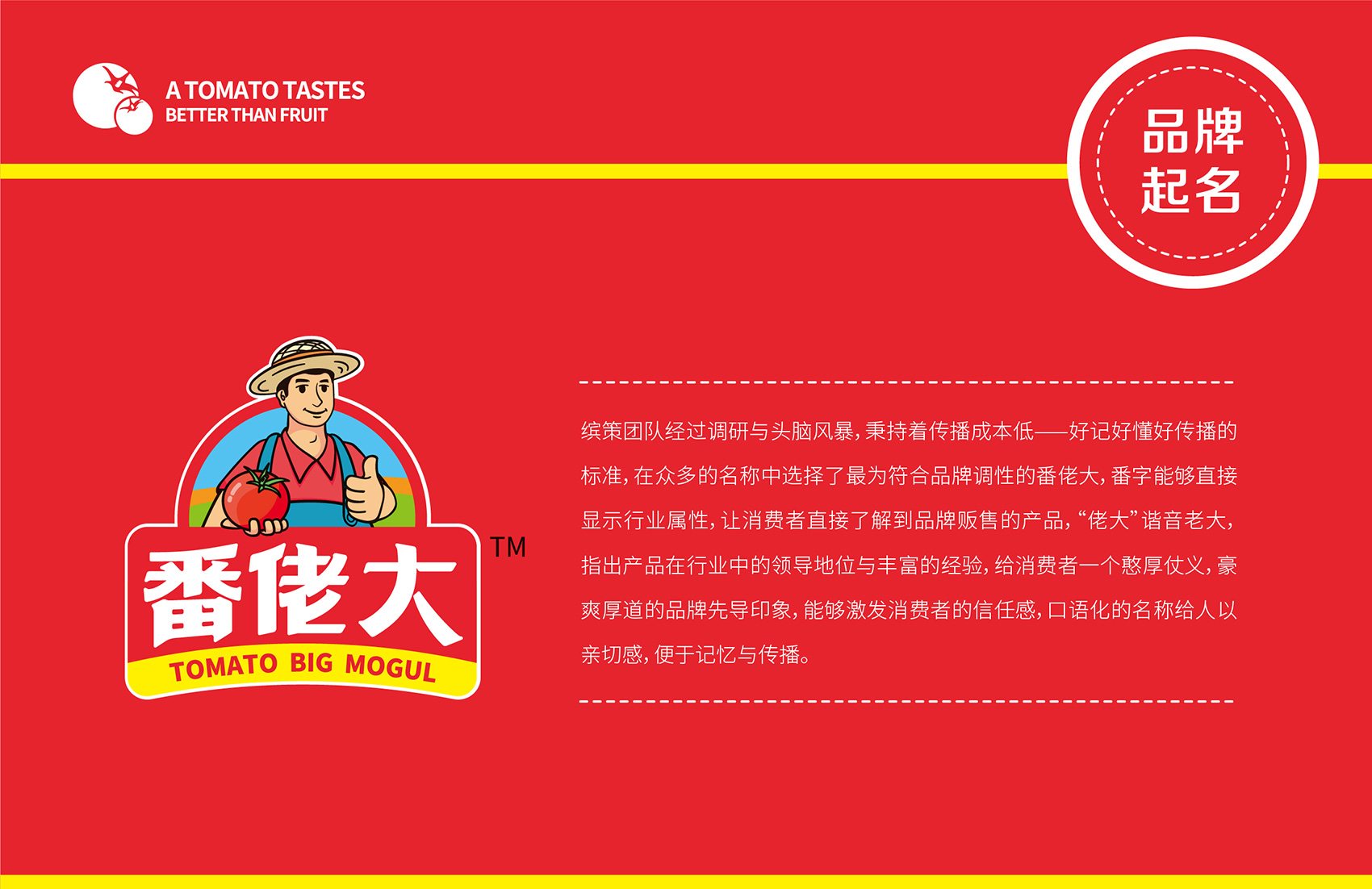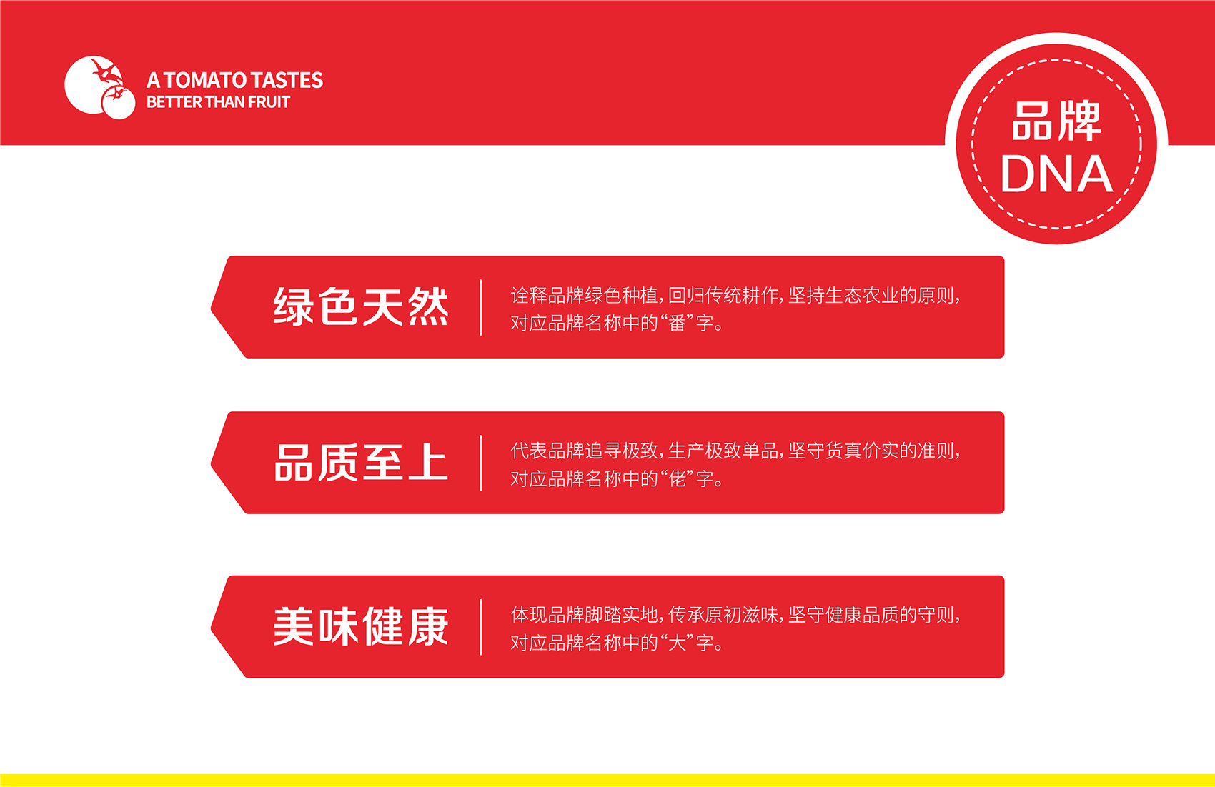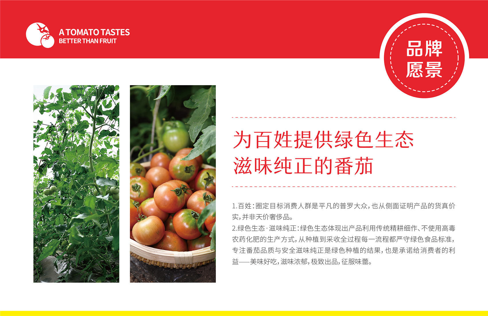 針對番佬大綠色生態番茄的定位,繽策提煉出純正為核心概念的文化體系,從品牌DNA開始不斷貫穿番佬大番茄的美好滋味,針對目標消費人群的審美偏好,以質樸平實的語言風格構建出綠色生態番茄的立體體系,slogan為“比水果還好吃的番茄”,不僅針對消費者做出品質的承諾與保證,讓消費者能清楚明了的了解番佬大值得信賴的原因,更是對企業內部的要求,指明了企業未來的發展方向,持續不斷的為百姓提供綠色健康,安全美味的品質番茄。