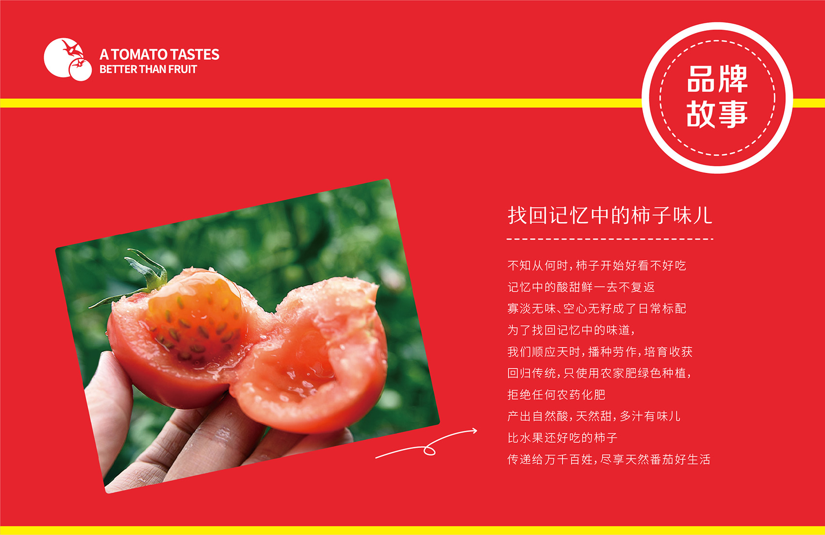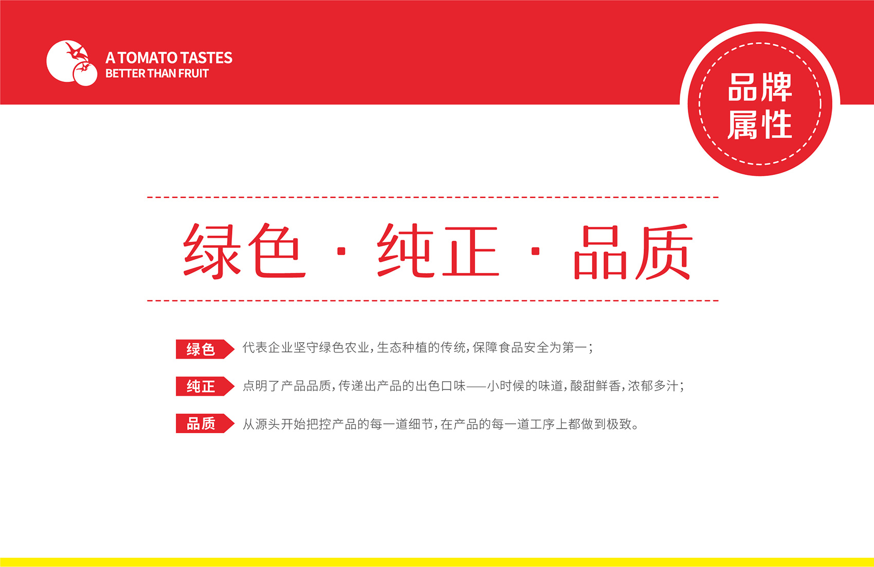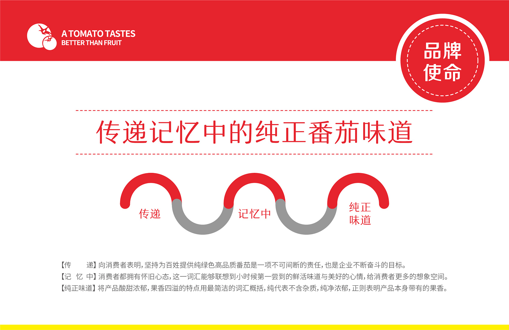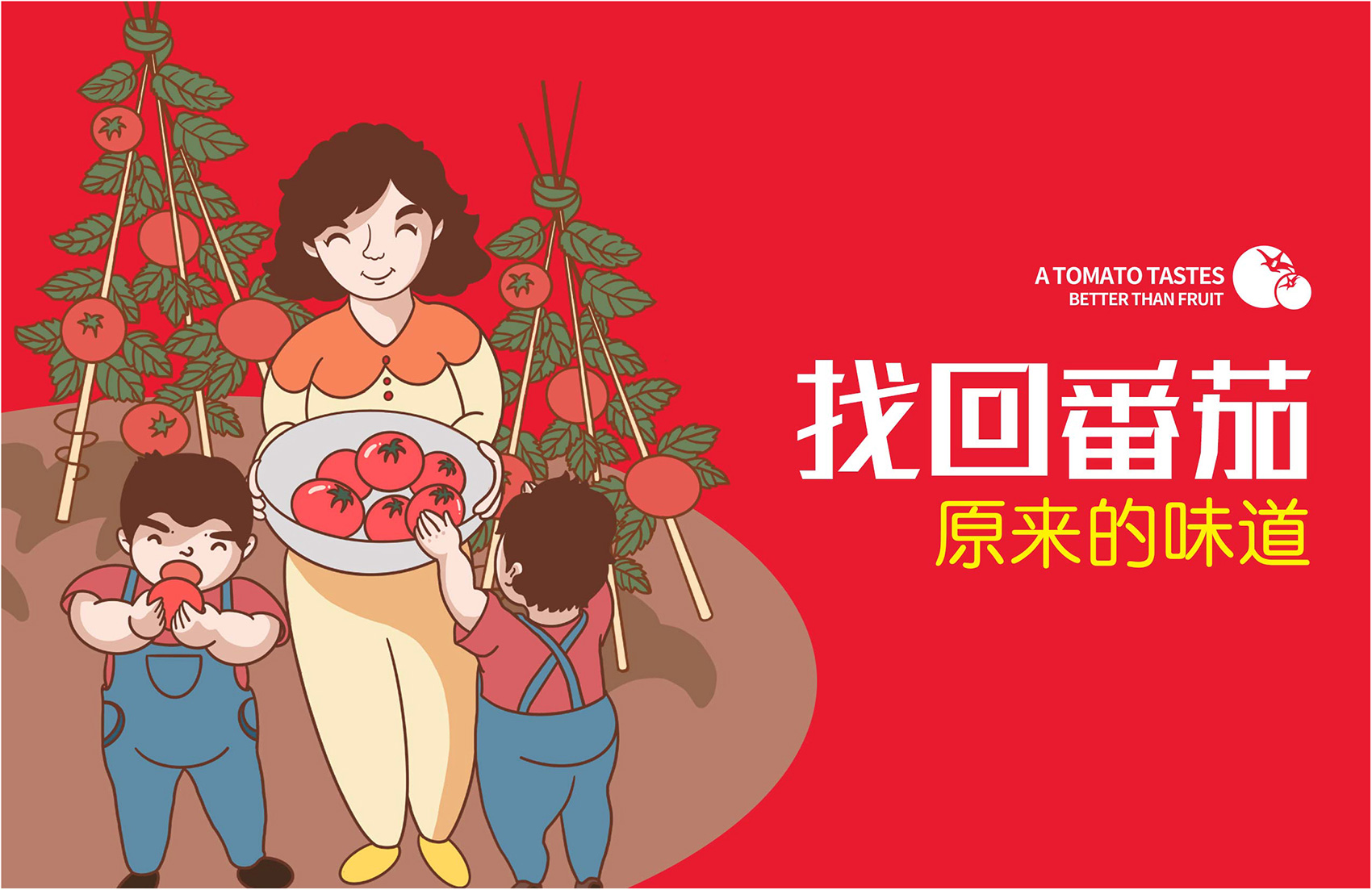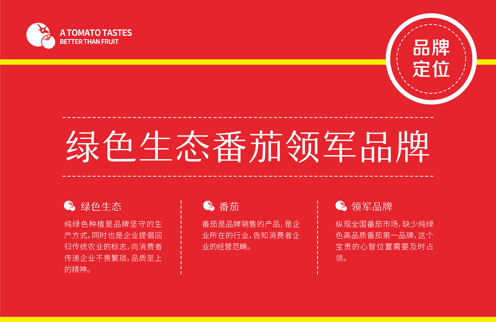 針對番佬大綠色生態番茄的定位,繽策提煉出純正為核心概念的文化體系,從品牌DNA開始不斷貫穿番佬大番茄的美好滋味,針對目標消費人群的審美偏好,以質樸平實的語言風格構建出綠色生態番茄的立體體系,slogan為“比水果還好吃的番茄”,不僅針對消費者做出品質的承諾與保證,讓消費者能清楚明了的了解番佬大值得信賴的原因,更是對企業內部的要求,指明了企業未來的發展方向,持續不斷的為百姓提供綠色健康,安全美味的品質番茄。