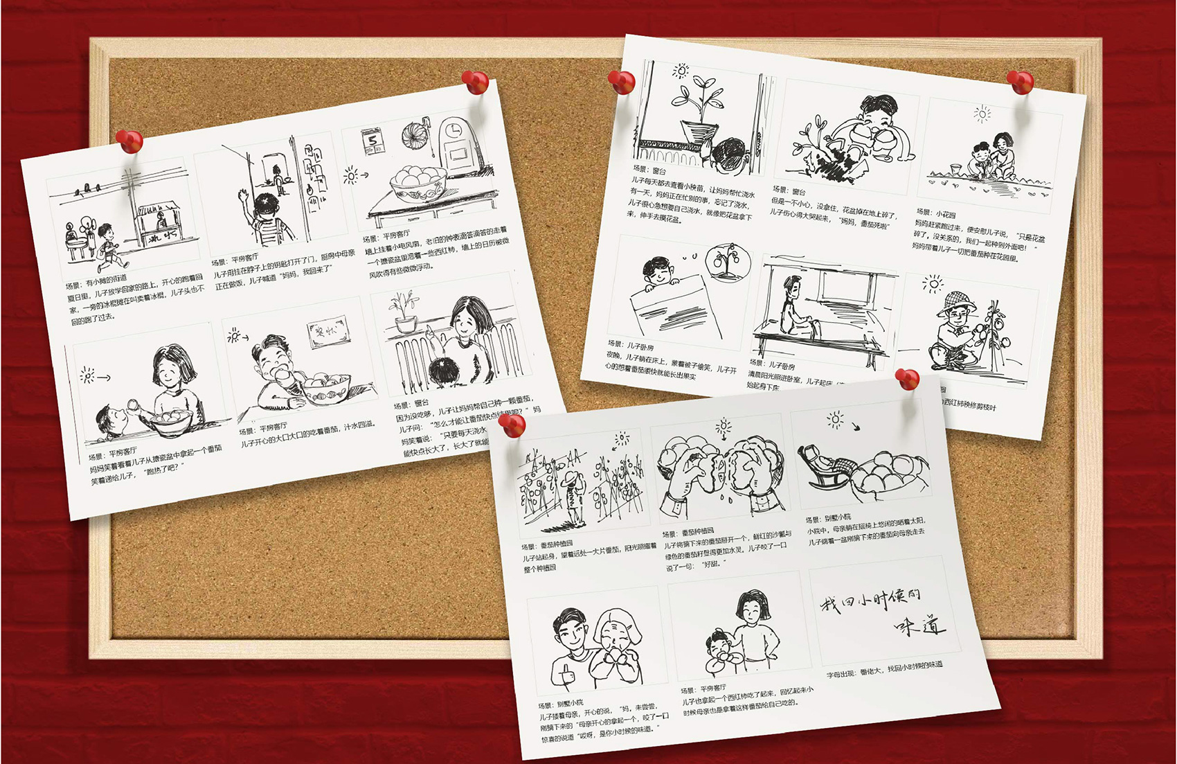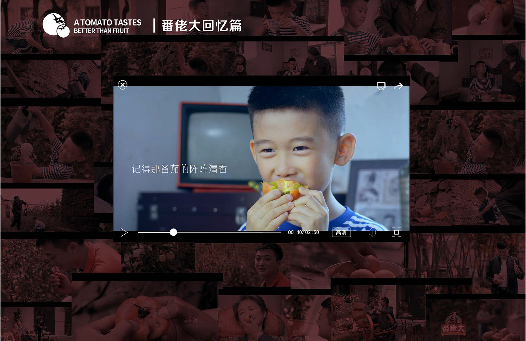 在以品牌理念與故事主導的回憶篇中,繽策構思了一個有關過去回憶的小故事,一個饞嘴的小男孩,在夏日午后大汗淋漓的跑回家,媽媽親手掰開的酸甜番茄,母子倆一起種下的種子……長大后的得償所愿,繽策想表達的是曾經的味道承載不僅僅是被埋沒在時光塵土中的老舊照片,而是那一段段難忘記憶的見證,找回美好的味道就是找回那些不變的美好,食物最動人之處便是每每嘗到那種滋味,便重溫那些與最愛的人之間的點點滴滴,用真情實感的構建的故事最能打動人心,而這與番佬大一直用高品質生態番茄打動所有味蕾的初心與信念不謀而合。對于場景中的過去場景的道具,繽策特別尋找了具有年代感的綠軍裝,鐵皮暖瓶,搪瓷盆,老式掛鐘等等,時代感撲面而來,帶領觀眾穿越到了從前。沒有華麗的臺詞,沒有炫酷的特效,也沒有花哨的鏡頭,只有樸實真摯的情感流淌在其中,正如番茄酸中帶甜的味道,總能勾起平凡卻不尋常溫馨記憶。