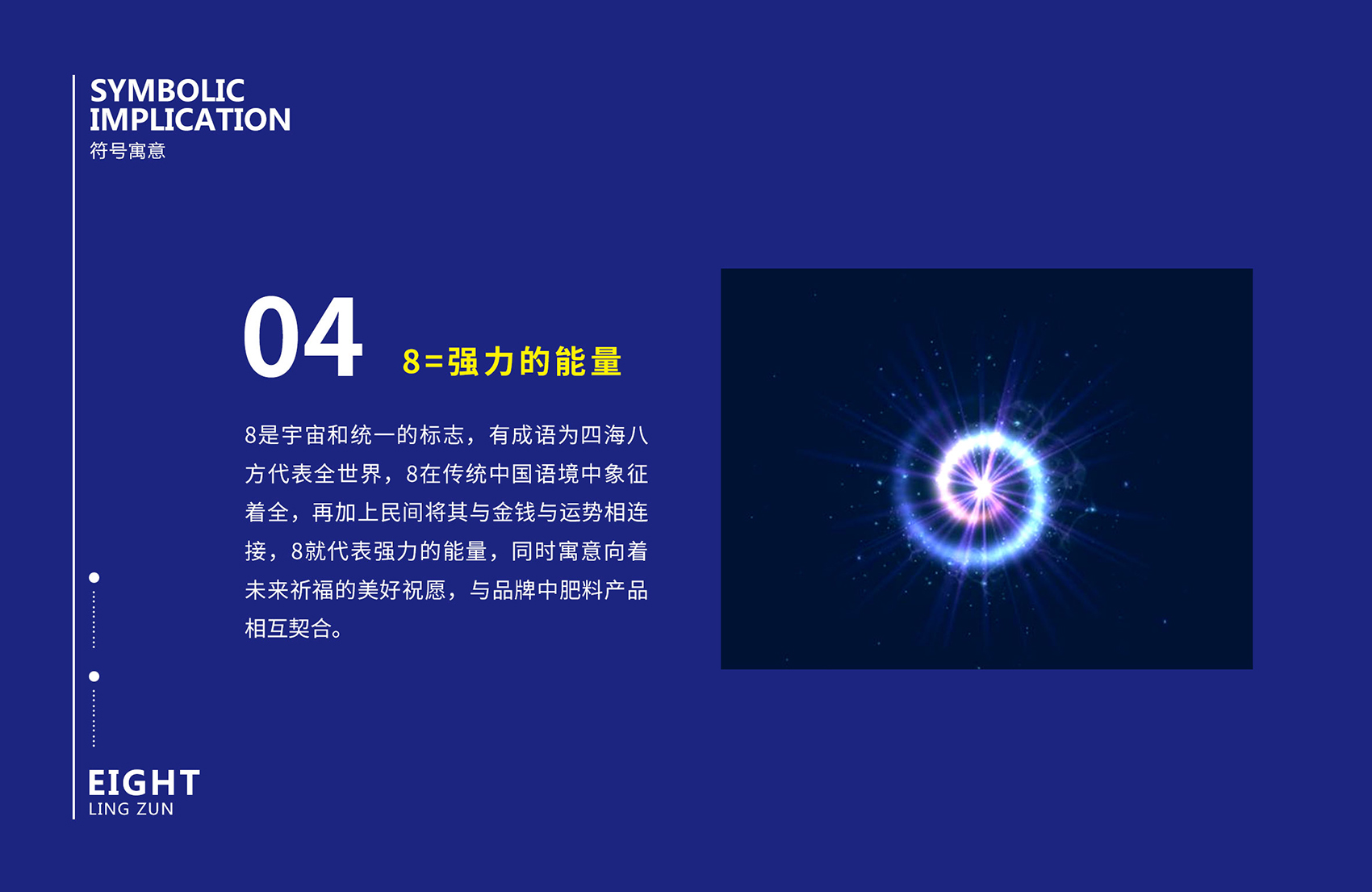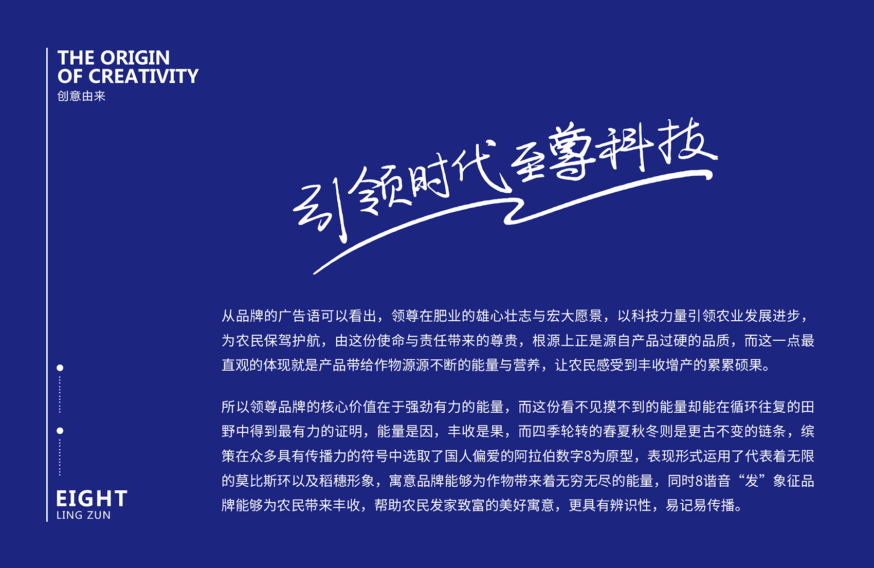 豐收一直是農民奮斗的目標,而肥料正是豐產增收的重要組成部分,從領尊的品牌廣告——引領時代,至尊科技可以看出,品牌在肥業的雄心壯志與宏大遠景,以科技力量引領農業發展進步,為農民保駕護航,這份使命與責任帶來的尊貴源自企業過硬的產品品質,所以消費者最希望看到的品牌核心價值就是肥料能夠擁有強勁能力,保證豐收增產,碩果累累。從這一角度入手,繽策思考能將看不見摸不到的能量用消費者熟悉的符號表現出來,能量是因,豐收是果,而新的果實又將變為種子再次播撒到田野中,四季輪轉中開始循環,所以阿拉伯數字8成為了代表領尊的超級符號。