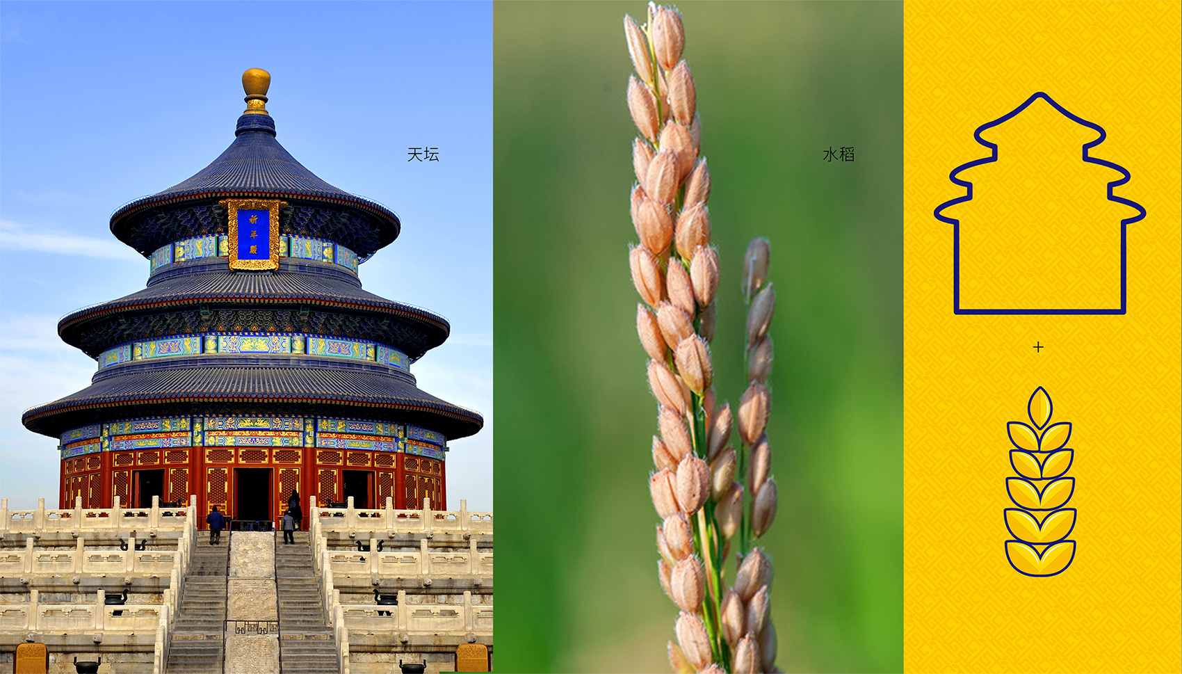 在品牌塑造的過程中,產品是即使,品牌是產品延續(xù)的保證。對企業(yè)來說,要創(chuàng)建一個強有力的核心資產,就必須在產品之上構架一個有說服力的、含有故事性的符號,并讓目標消費群體能夠理解記憶的方式進行落地,在認知中構建品牌信念,從而建立品牌知名度與消費者忠誠度。繽策根據(jù)目標消費人群的特點選取了印章這一超級符號為品牌打造logo,并融入傳統(tǒng)紋章樣式傳遞出品牌對于品質的承諾;在包裝符號上延續(xù)標志厚重大氣的調性,以中國傳統(tǒng)標志性建筑天壇作為主體,加入稻種、山水紋樣進行品牌專屬性改造,借用符號本身的權威性與辨識度進一步獲取消費者的信任,同時也傳遞出品牌將為創(chuàng)造出五谷豐登、國泰民安的美好未來而努力奮斗。