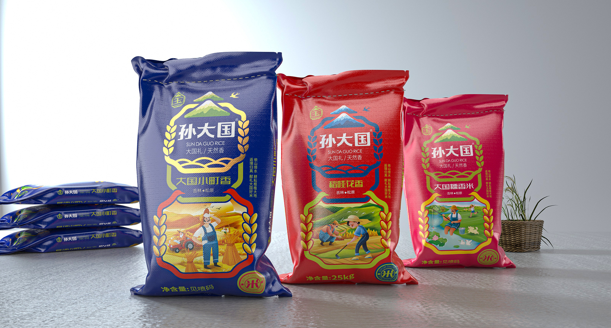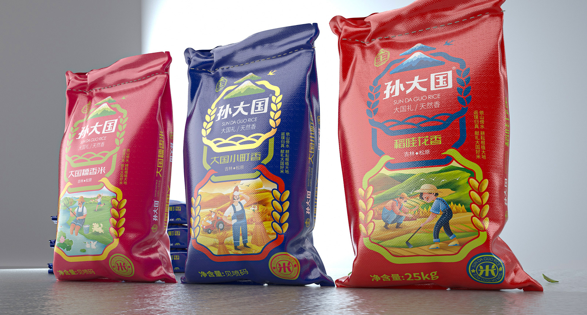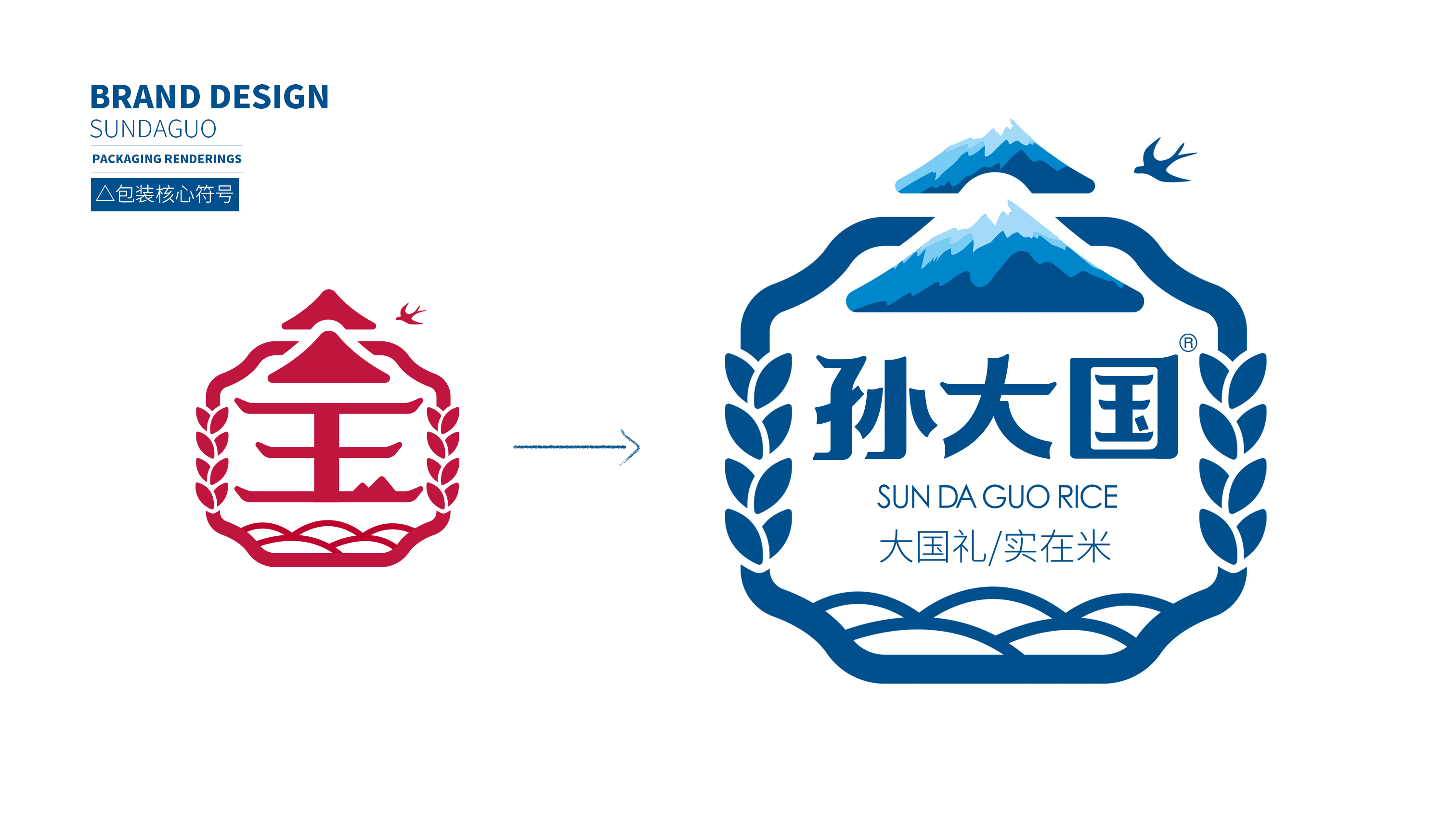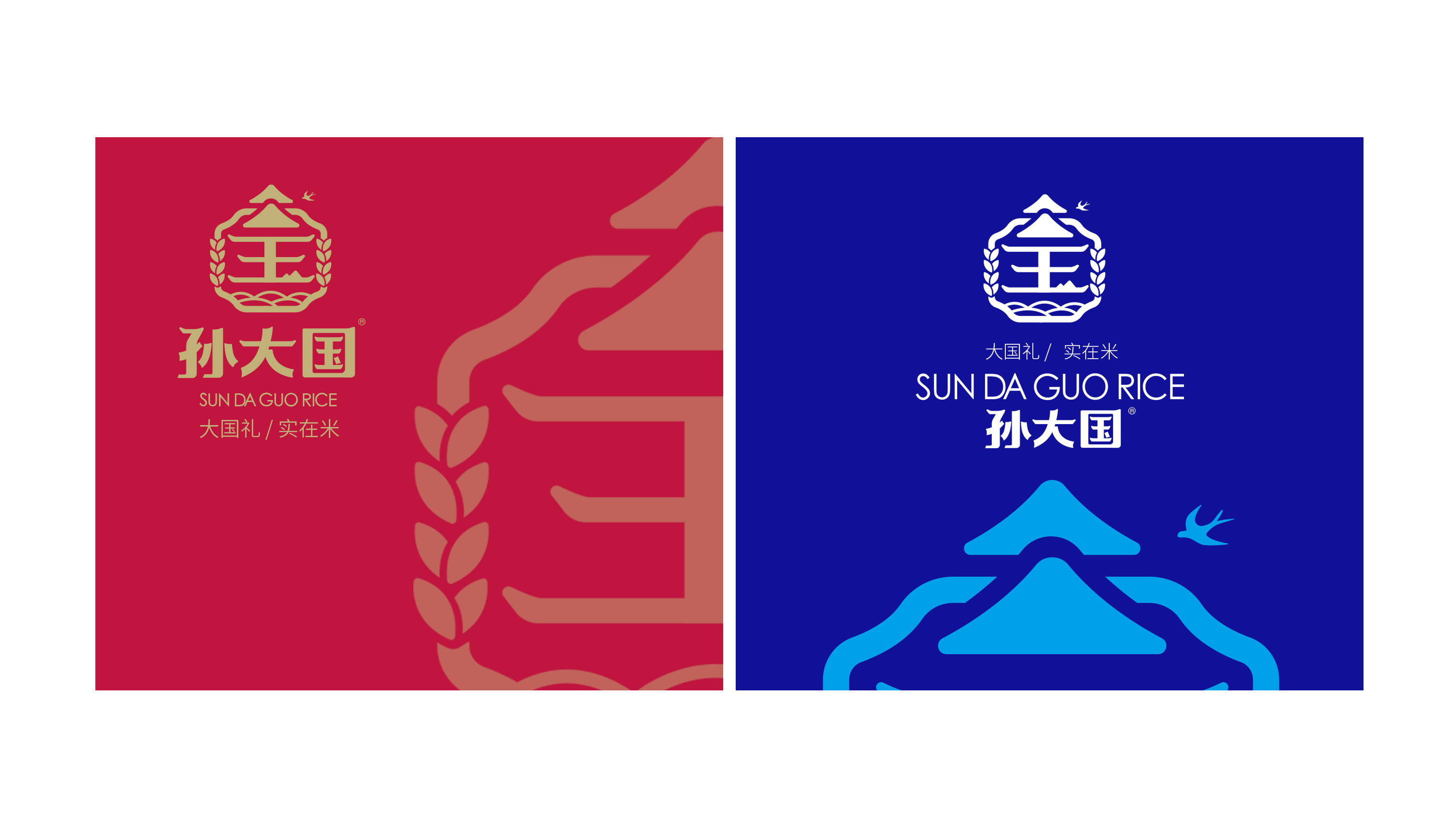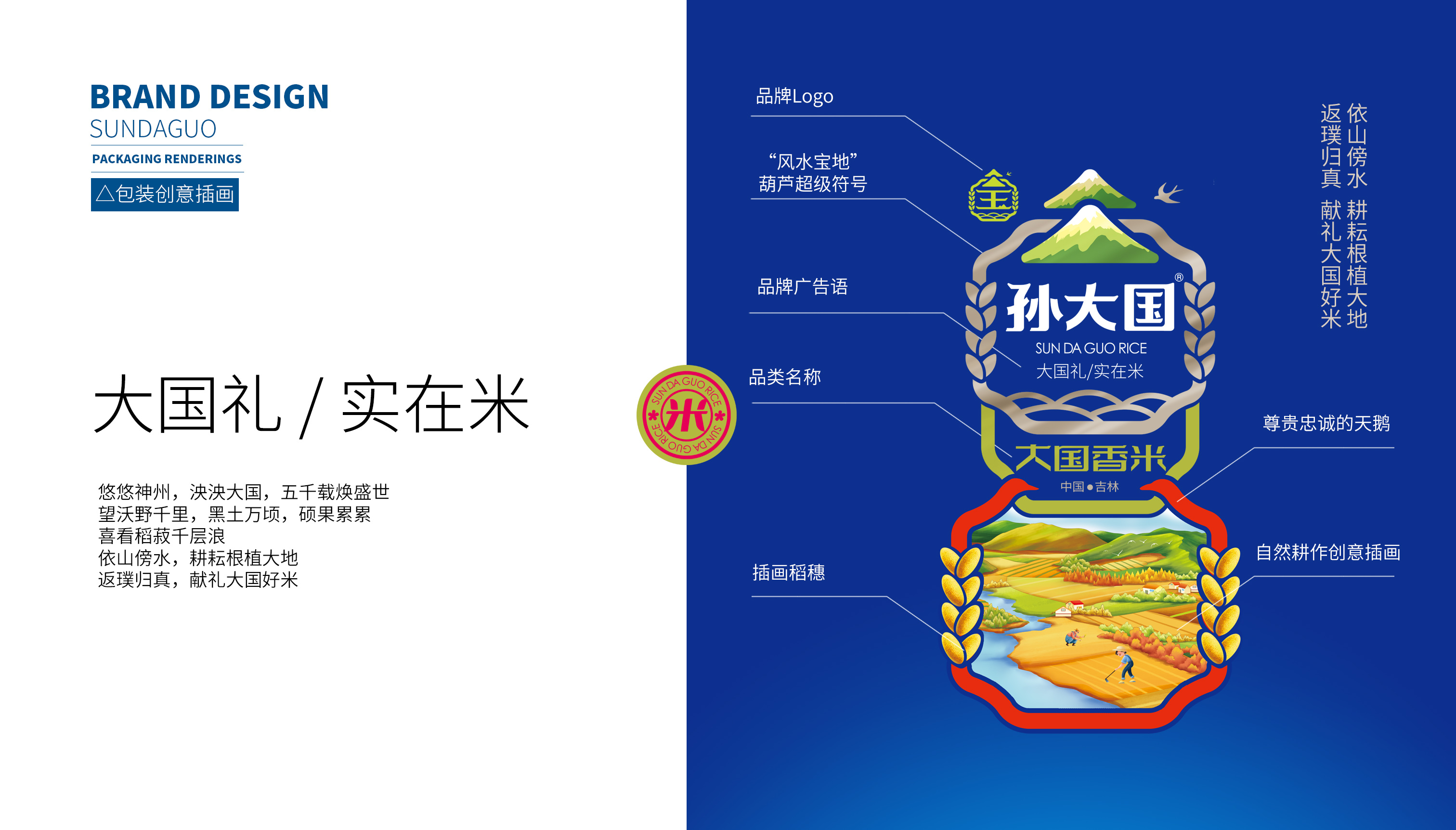 所以有品牌的最終目的都是為了讓消費者在需要時第一想到它,進而進行消費,所以達成現任的第一步是識別和記憶,品牌名稱是消費者需要記住的核心概念,所以繽策從孫大國這個品牌名稱下手,提煉了國這個自帶流量且更容易記憶的字,并創造了一條自帶營銷屬性的廣告語——“大國禮,實在米”,大國禮的定義首先將品牌與其他同類競品拉開了距離,暗示品牌是國禮級別的品質,而實在米則是針對偏重價格性價比的消費人群量身打造,在告訴打擊是童叟無欺的好大米和品牌踏實做事的態度。并在此的核心概念下折了logo,融入行業屬性的同時借助傳統文化將其打造的既熟悉又新穎;包裝方面延續logo形式,以超級符號的形式將品牌最大的視覺化呈現在包裝上,在不斷的突出與重復之中將品牌融入消費者心智中,并與之建立長久的聯系,以最高效的傳播力與和諧之感在同類競品中脫穎而出,幫助企業順利進入消費市場。