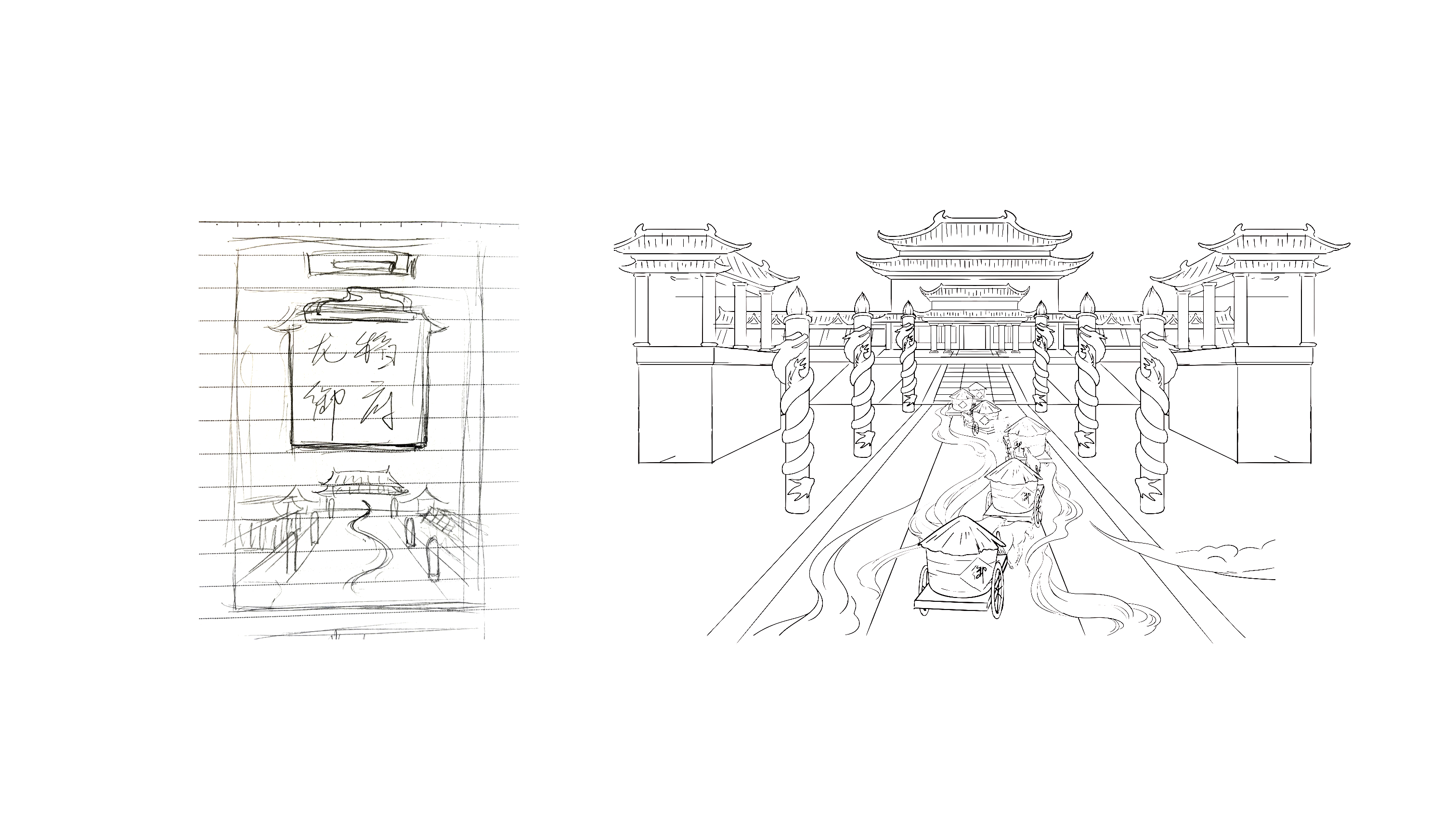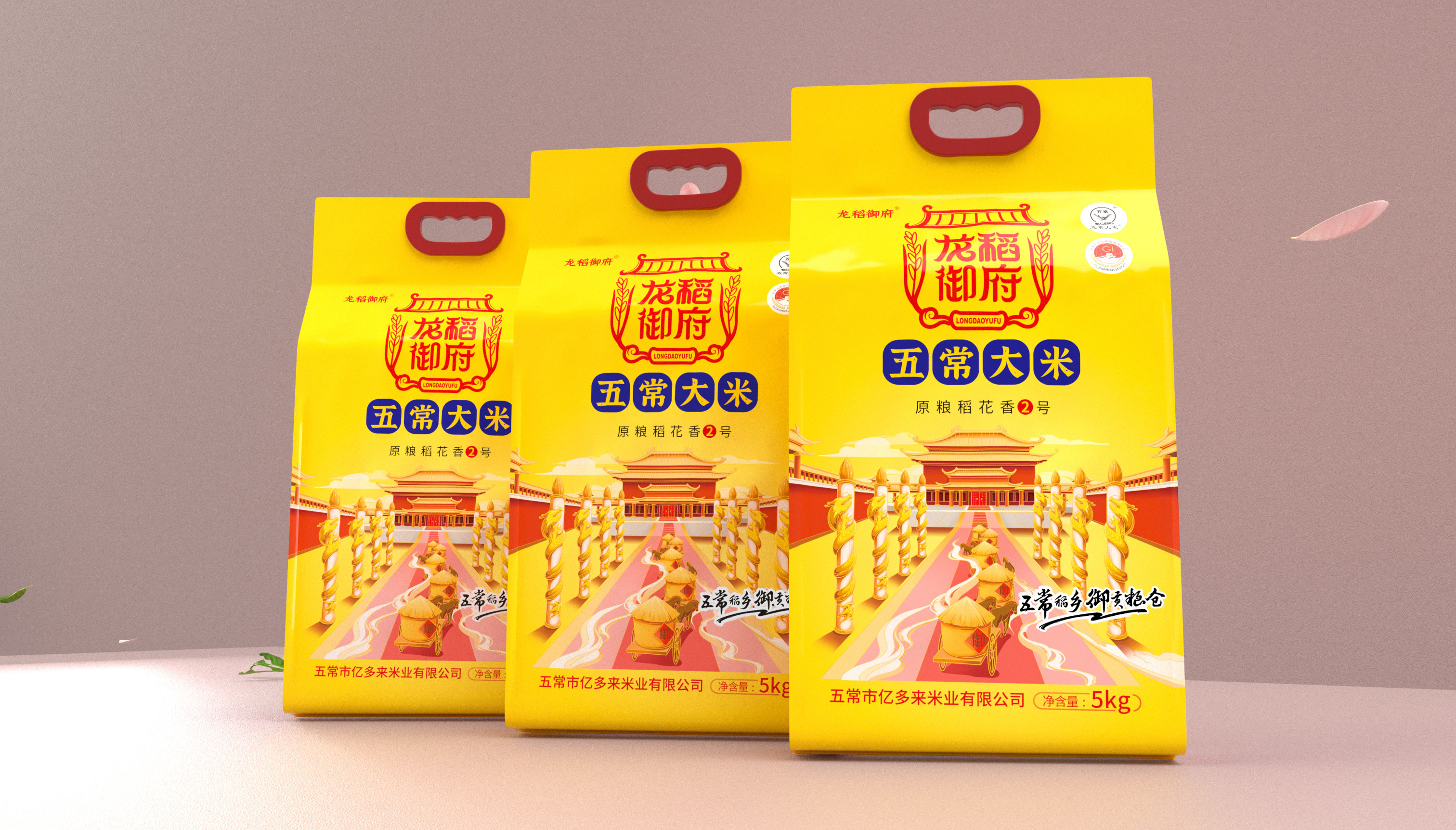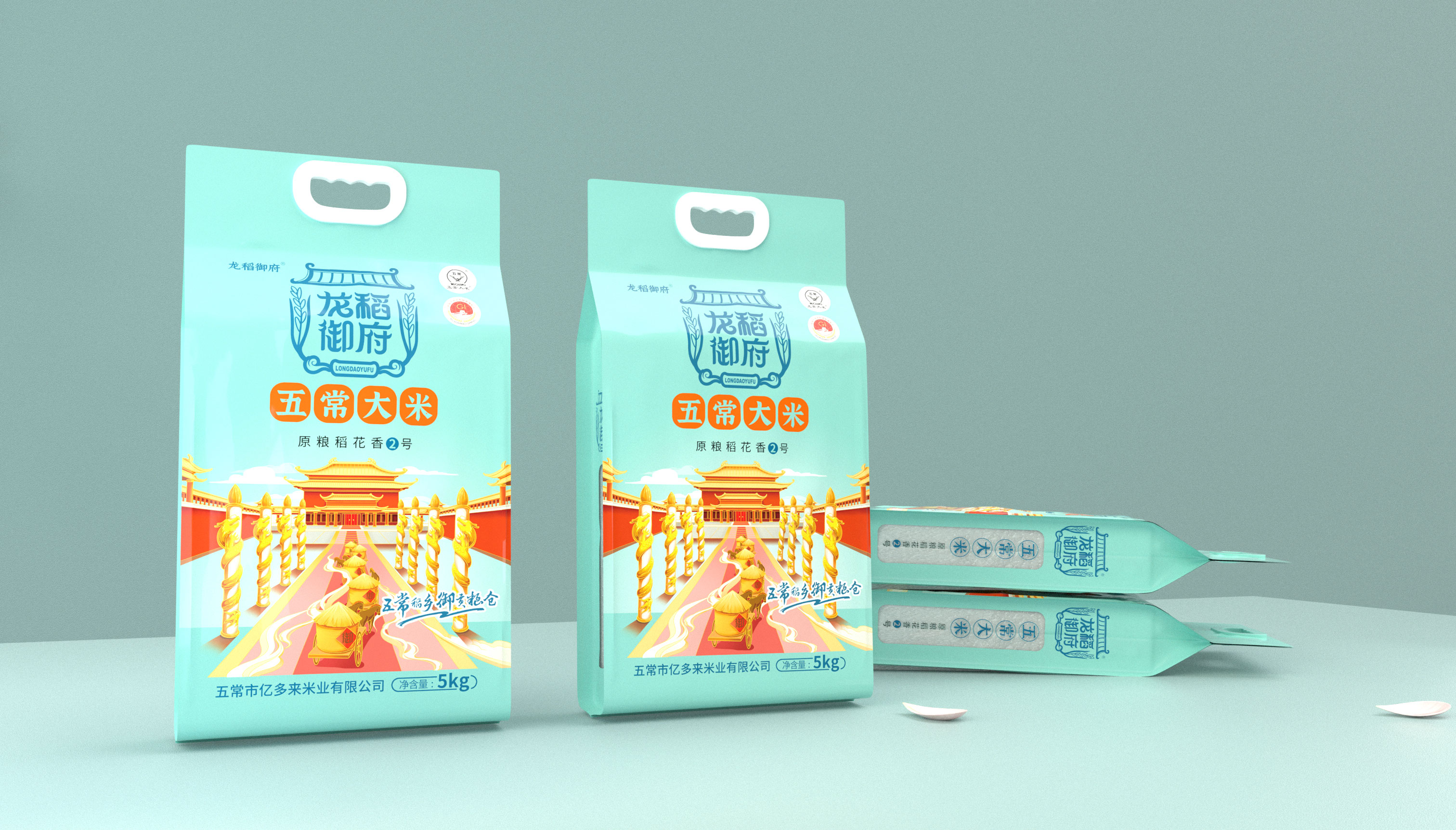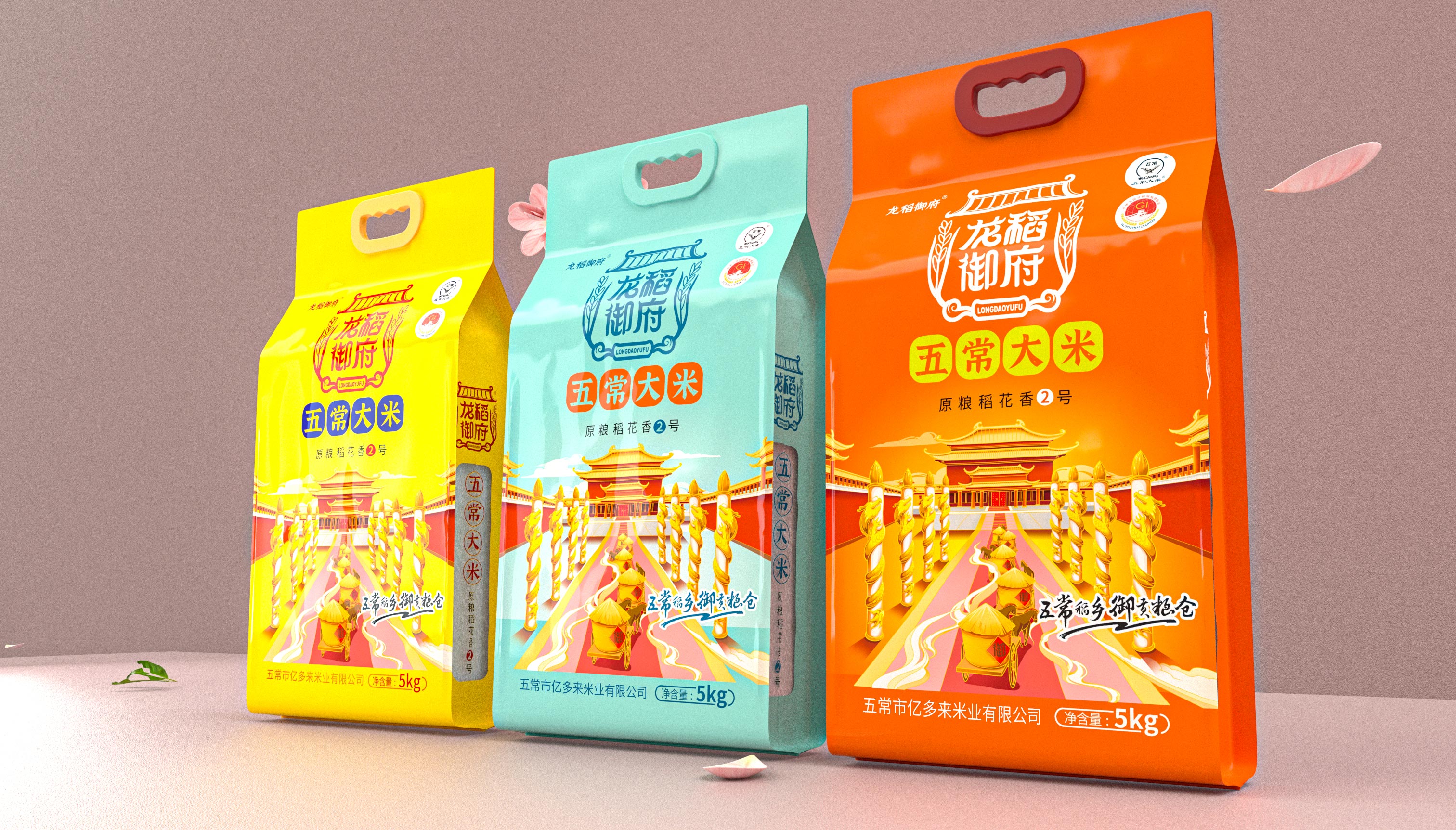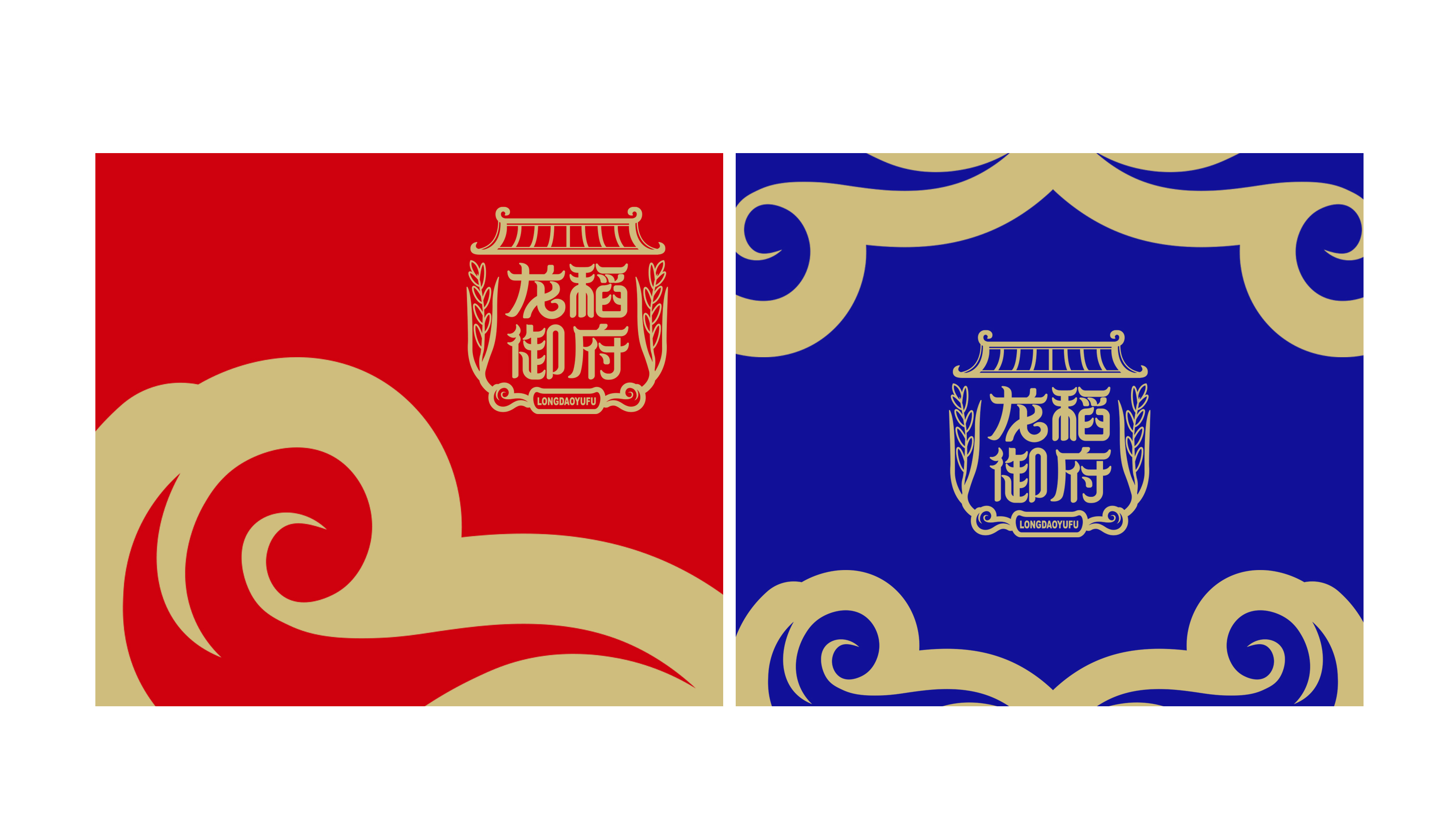 從品牌名稱分析,龍即龍江、龍頭,龍稻可以理解成龍江地區的頂級水稻,御府的含義為皇家糧倉,那么龍稻御府指代的就是龍江地區產出的御貢品質的大米。在傳播層面上,品牌名稱雖然意蘊深厚,但字數較多,較為繞口,不利于消費者記憶,為了彌補這一缺陷,將圍繞御府為中心,打造連接概念與視覺的超級符號,采用生動形象的畫面演繹品牌,通過厚重細膩的半寫實風格來描繪御貢稻米的主題,凸顯品牌的尊貴與品質。