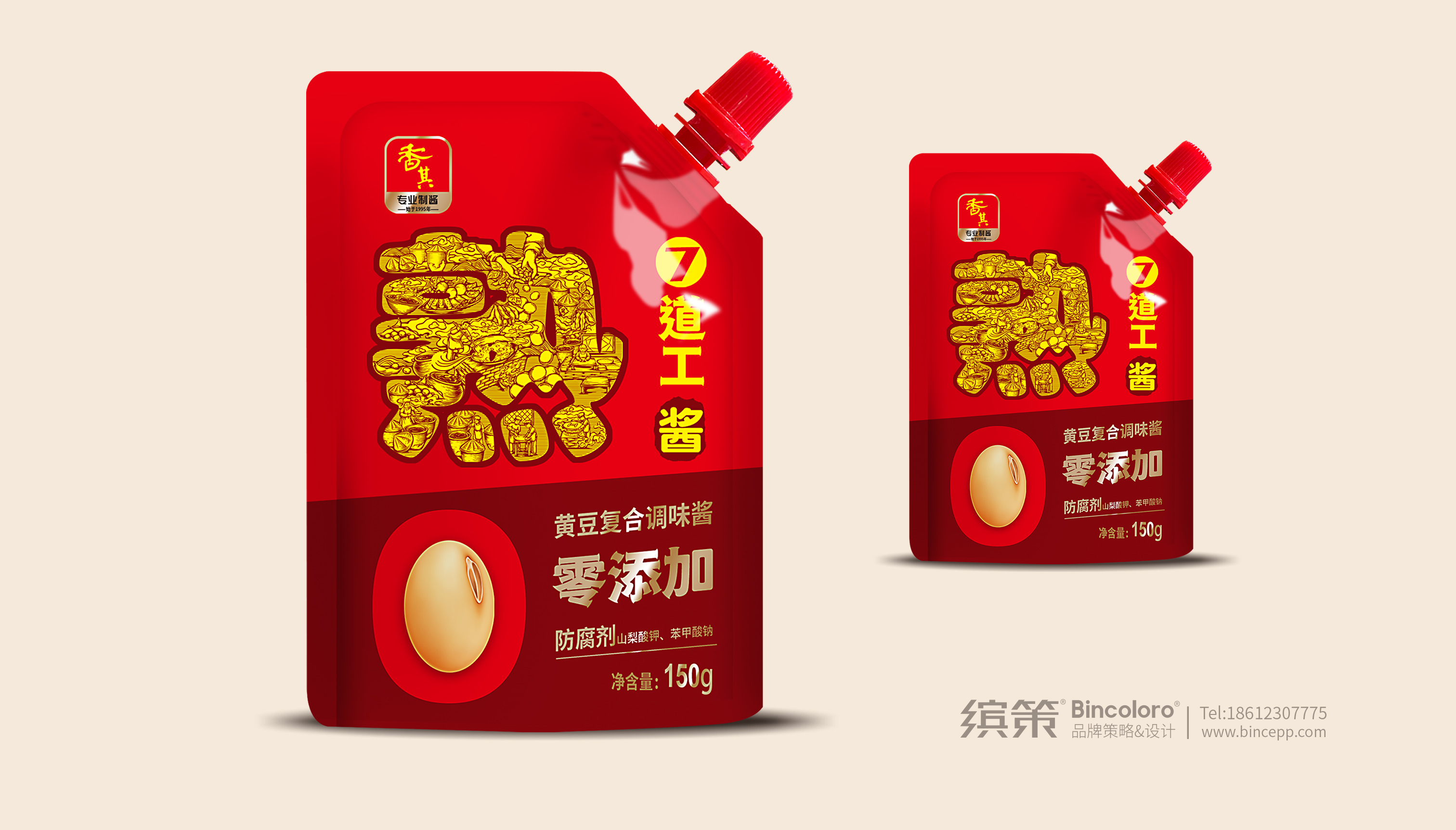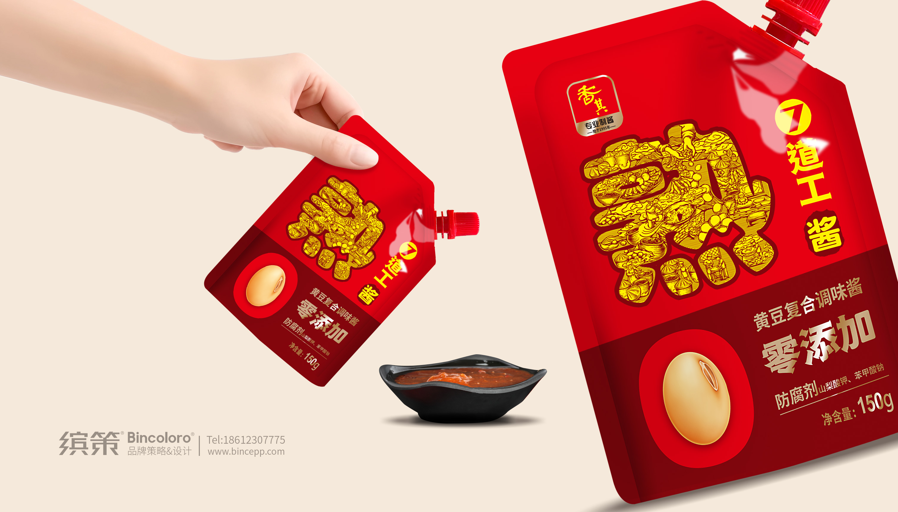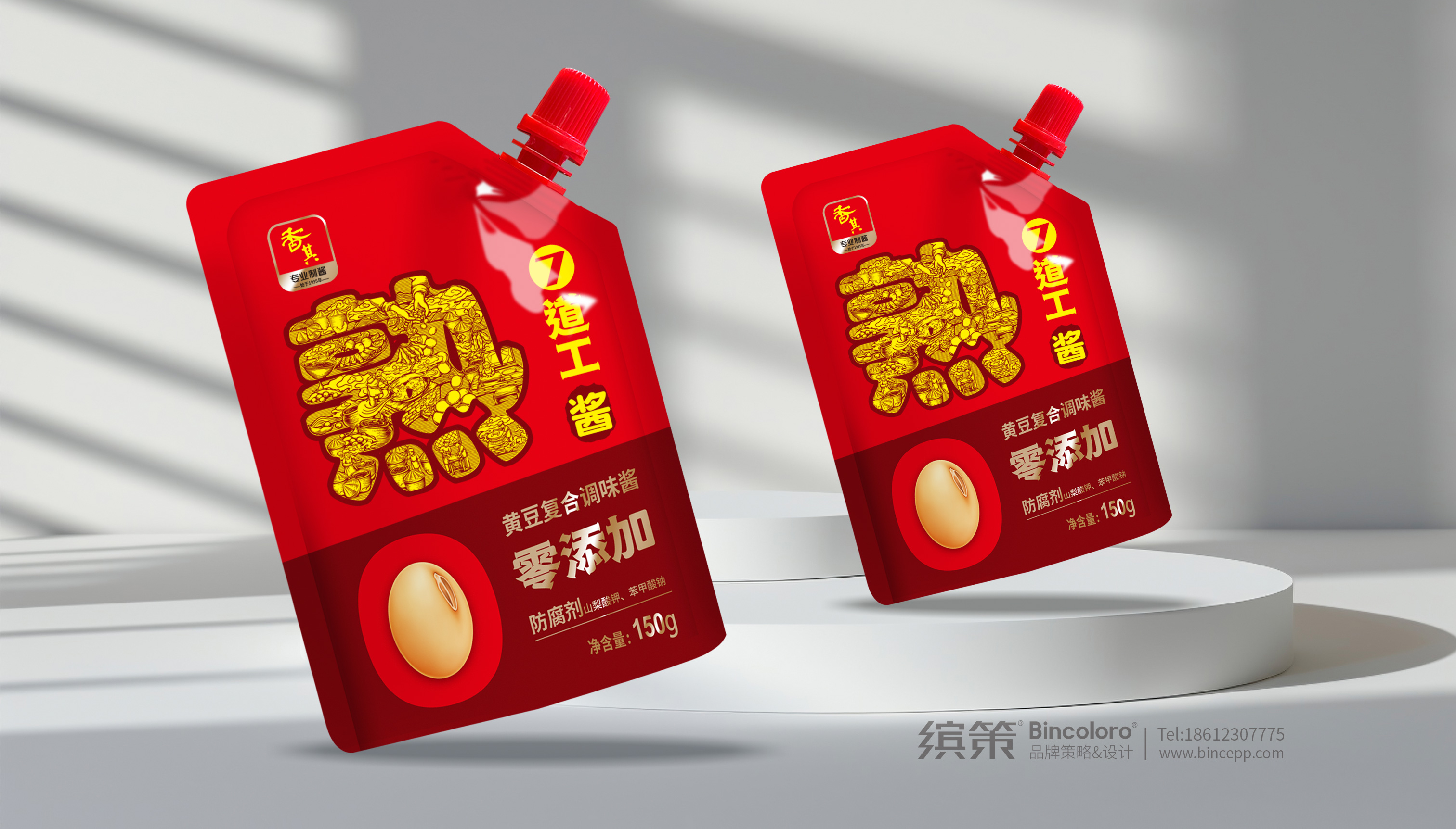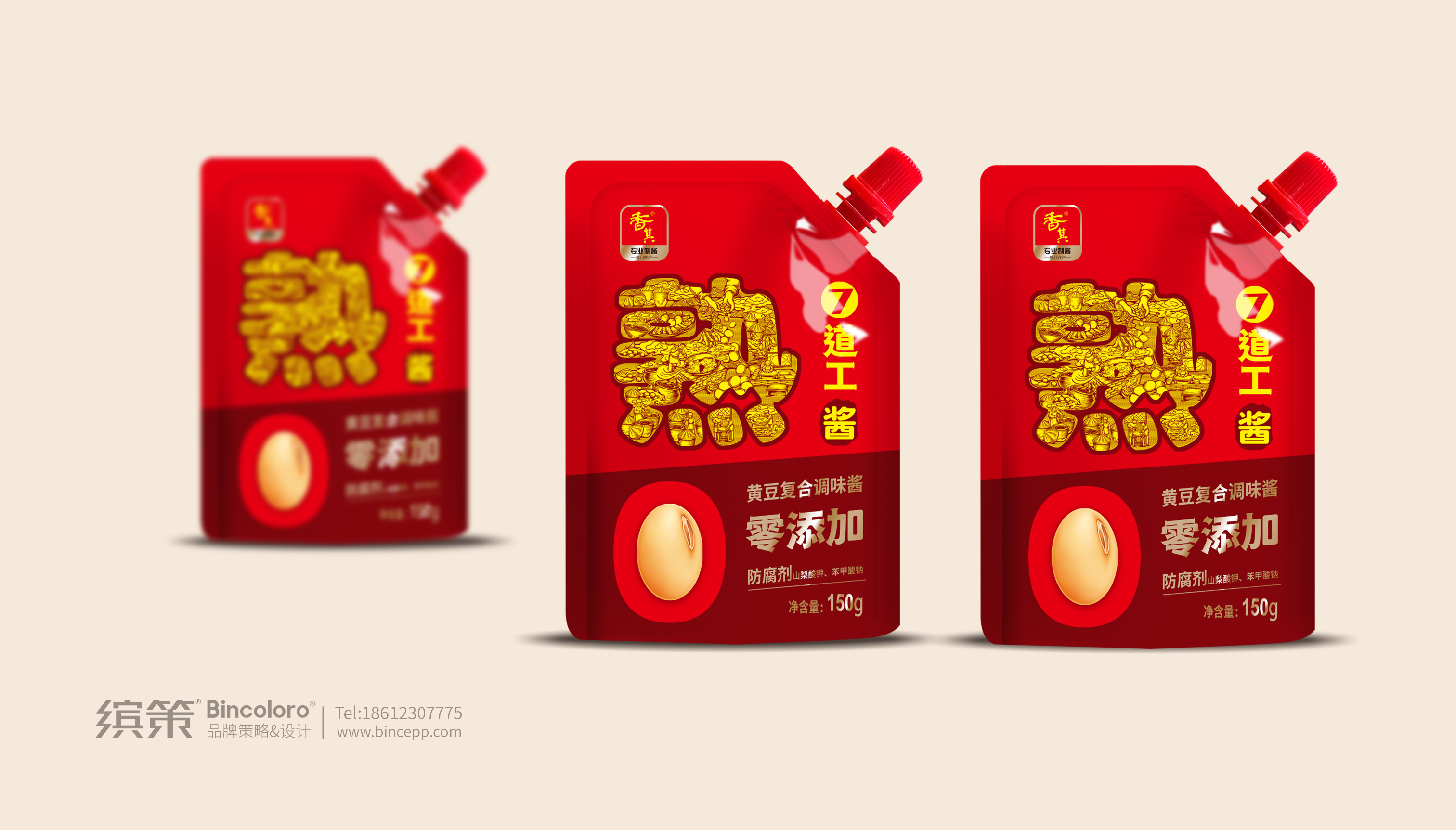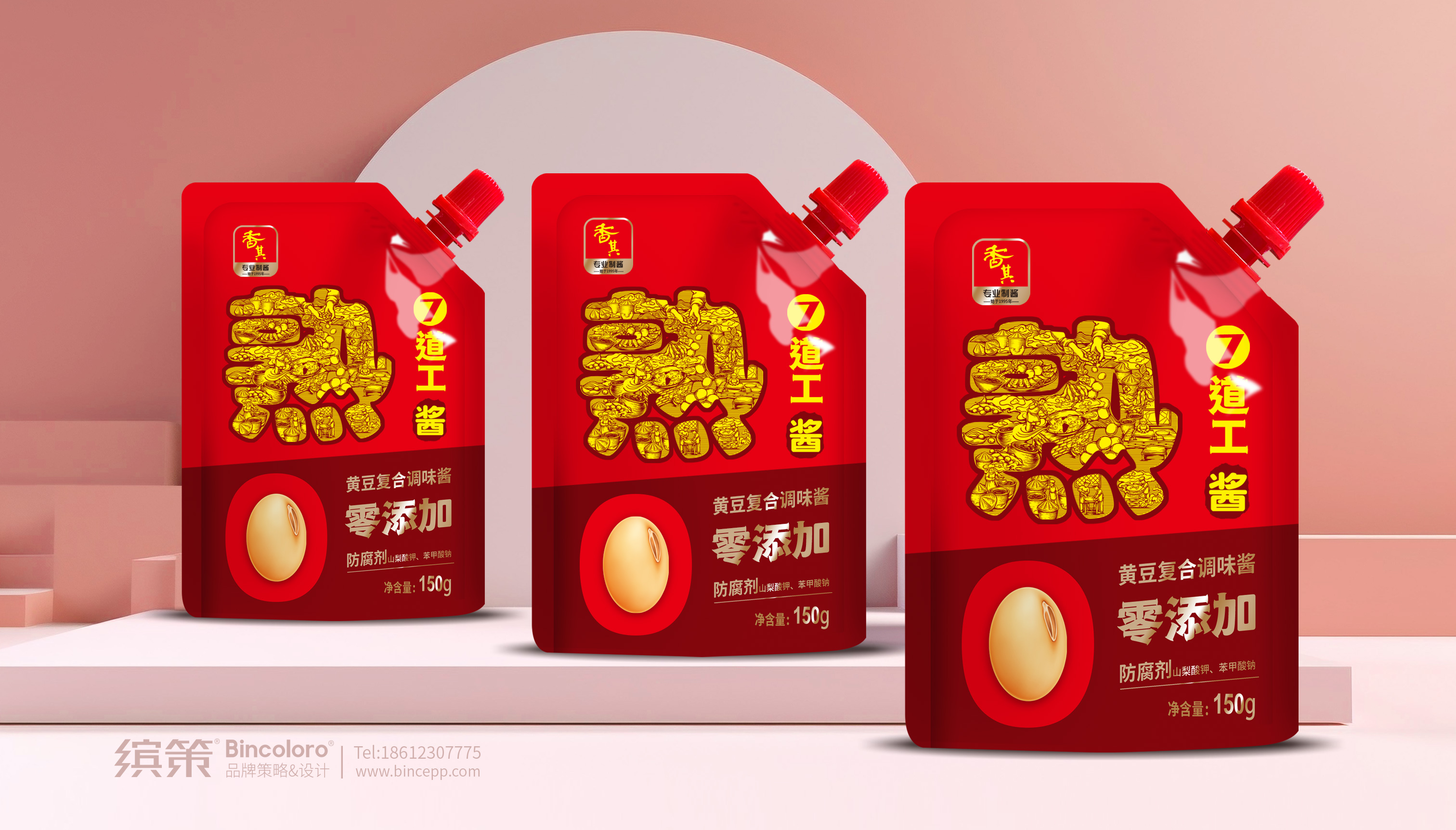 品牌的核心是直指消費者心智,指引購買意愿,而最終呈現就是包裝,在最短時間內向將產品賣點呈現出來,并引導消費者進行記憶與購買。從認知-記憶-認同-復購的行為模式上來說,超級符號能最有效的吸引眼球,將核心概念植入消費者心智,同時也提供了購買依據,所以繽策將"熟"字提煉出來,結合傳統七道工藝與零添加的專屬特點,共同打造獨屬于香其醬的熟醬符號。幫助品牌重塑消費者心智。