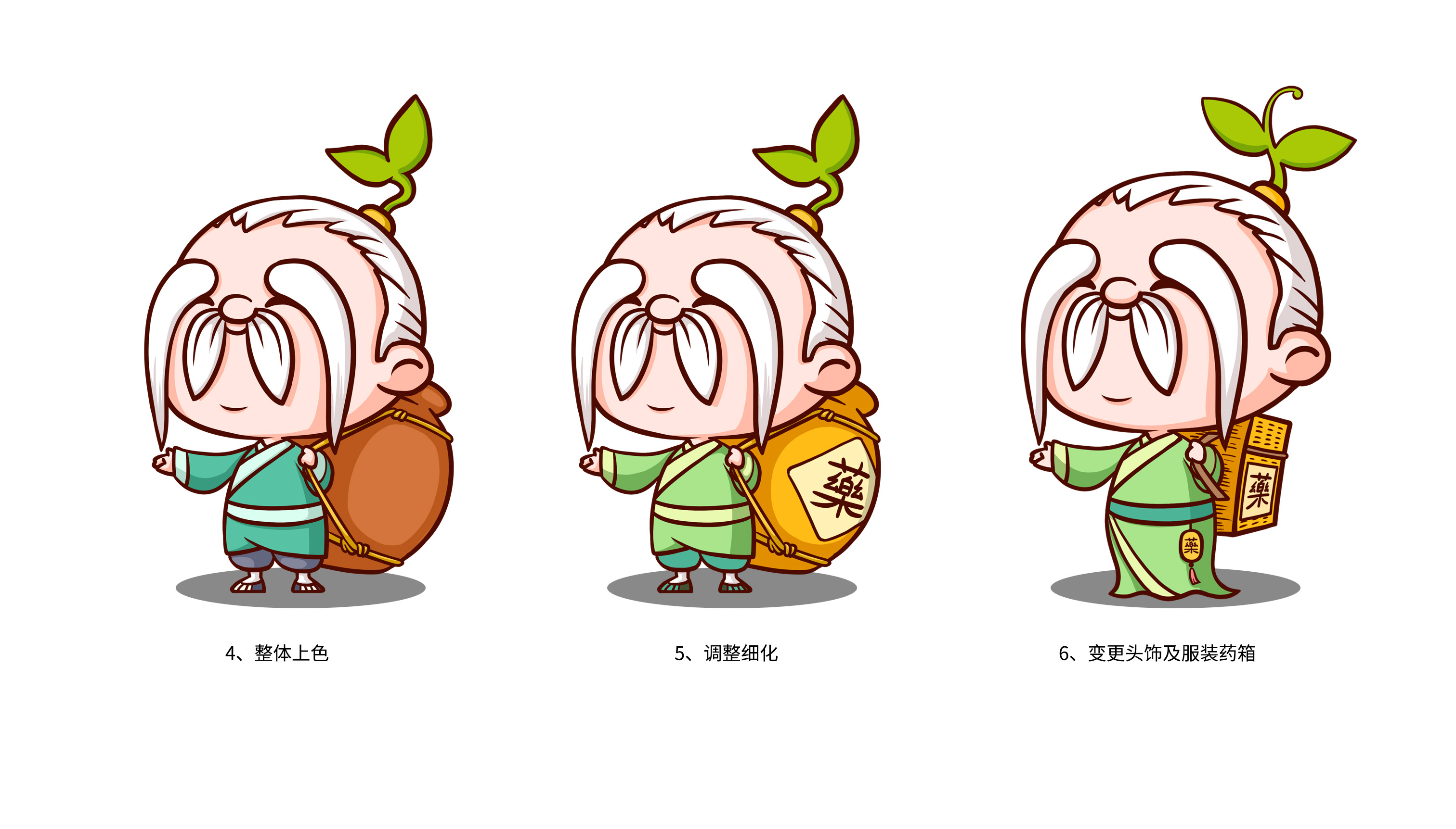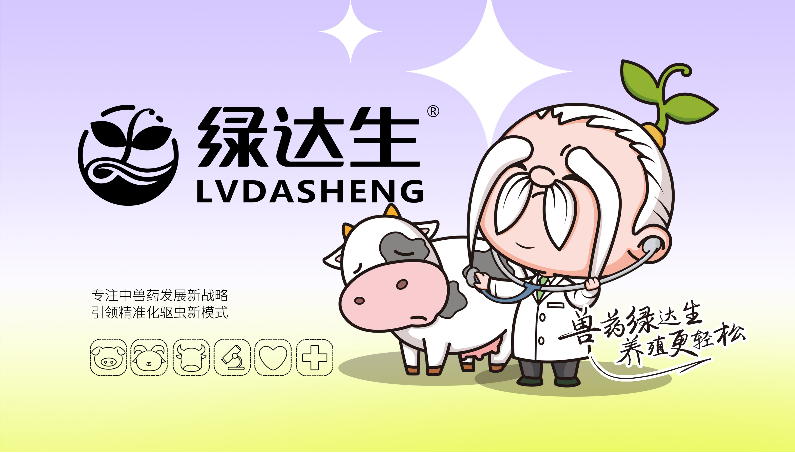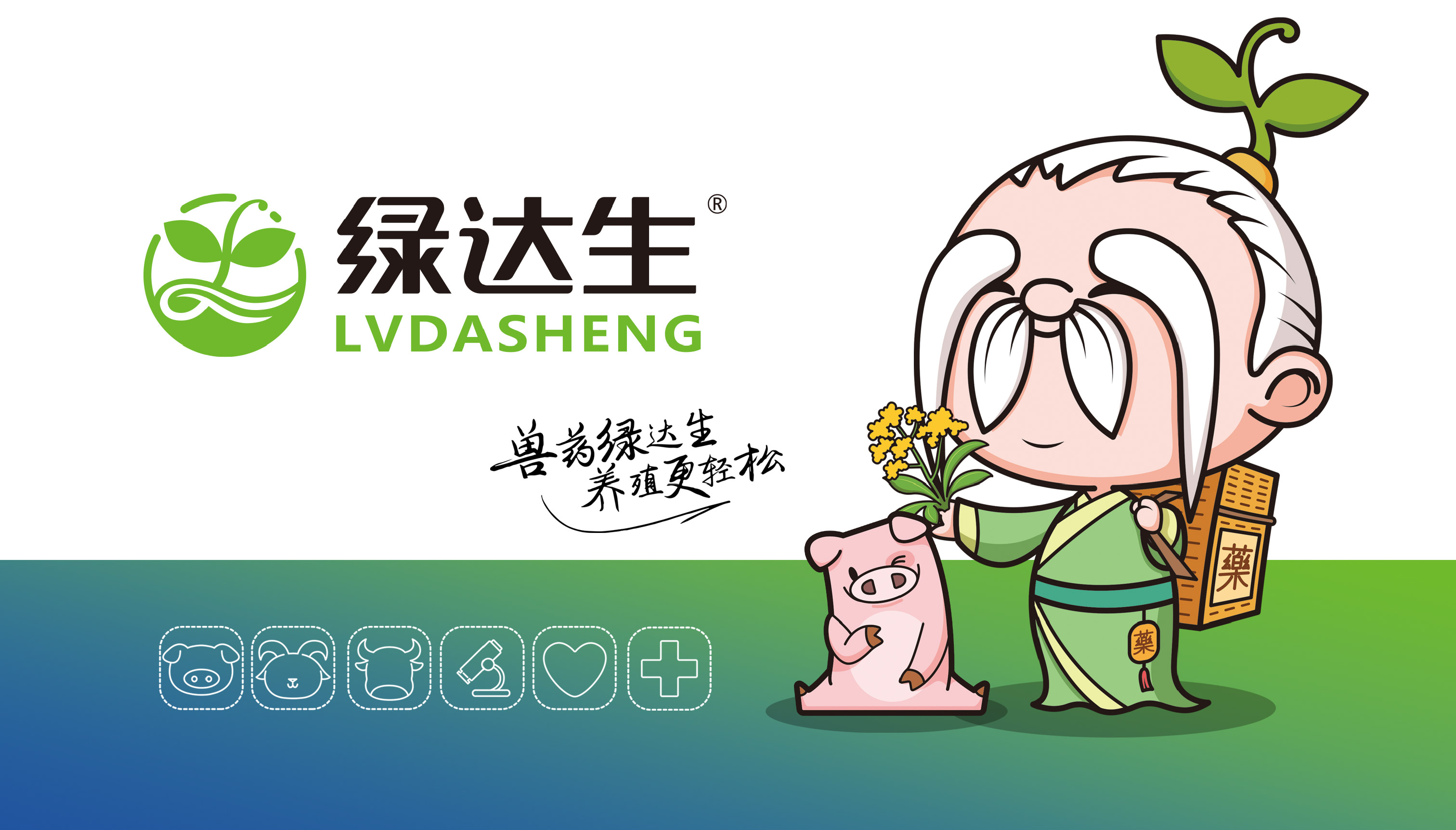 企業在市場廝殺多年,原有的標志已經在大批消費者心中積累了一定的認知資產,標志不能大刀闊斧的改動,而是在原有基礎上優化逐漸替代原有標志;同時需要明確的是企業的核心定位和競爭力,需要回答綠達生究竟是誰以及能夠解決的問題。繽策將企業核心品類的獸藥提出并強化,打造出企業專屬slogan——獸藥綠達生,養殖更輕松,一舉解決品牌認知和選擇難題;而在視覺傳播上,選擇時下流行的IP能夠幫助消費者快速辨別和認知品牌,同時也將于市場同類競品相互區別,進而脫穎而出,根據品牌獸藥的行業特性,將品牌IP設定為有草藥精靈幻化而成的道骨仙風的老中醫,形象獨特可愛,同時融入傳統中醫元素,打造讓國人更有共鳴的形象,并一以貫之的落實在包裝及延展上。