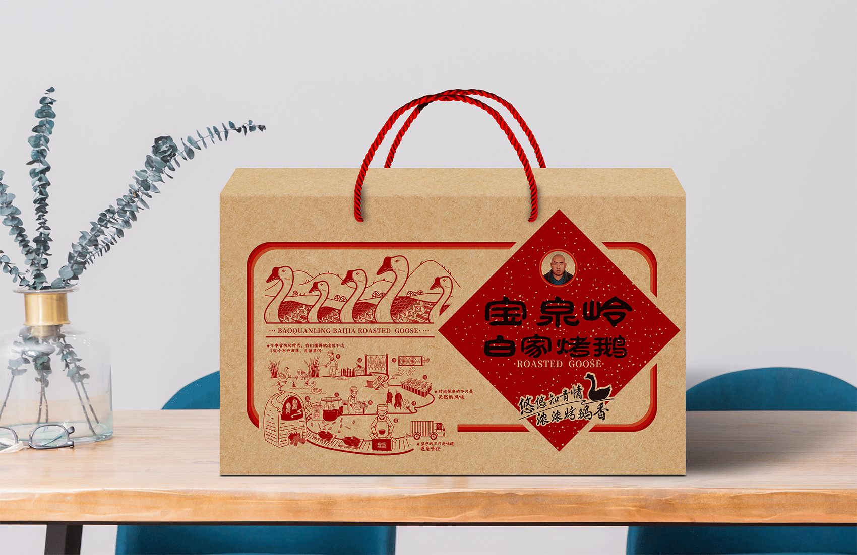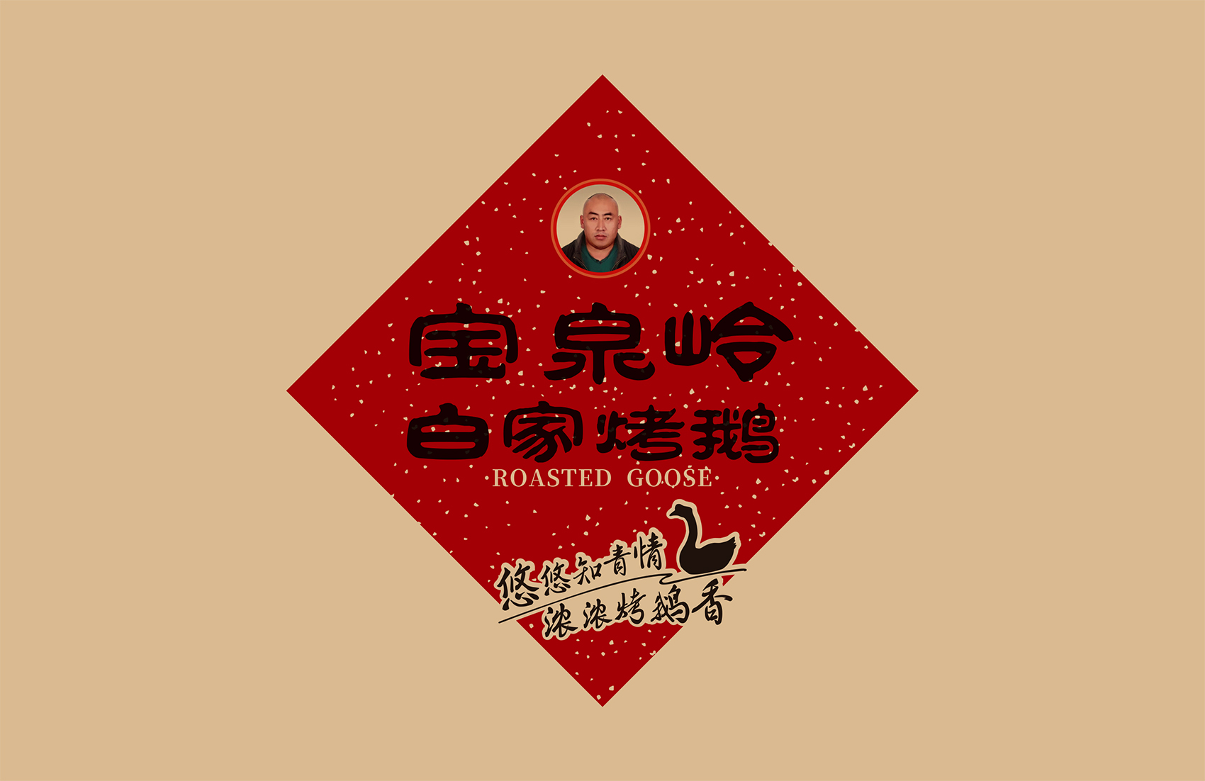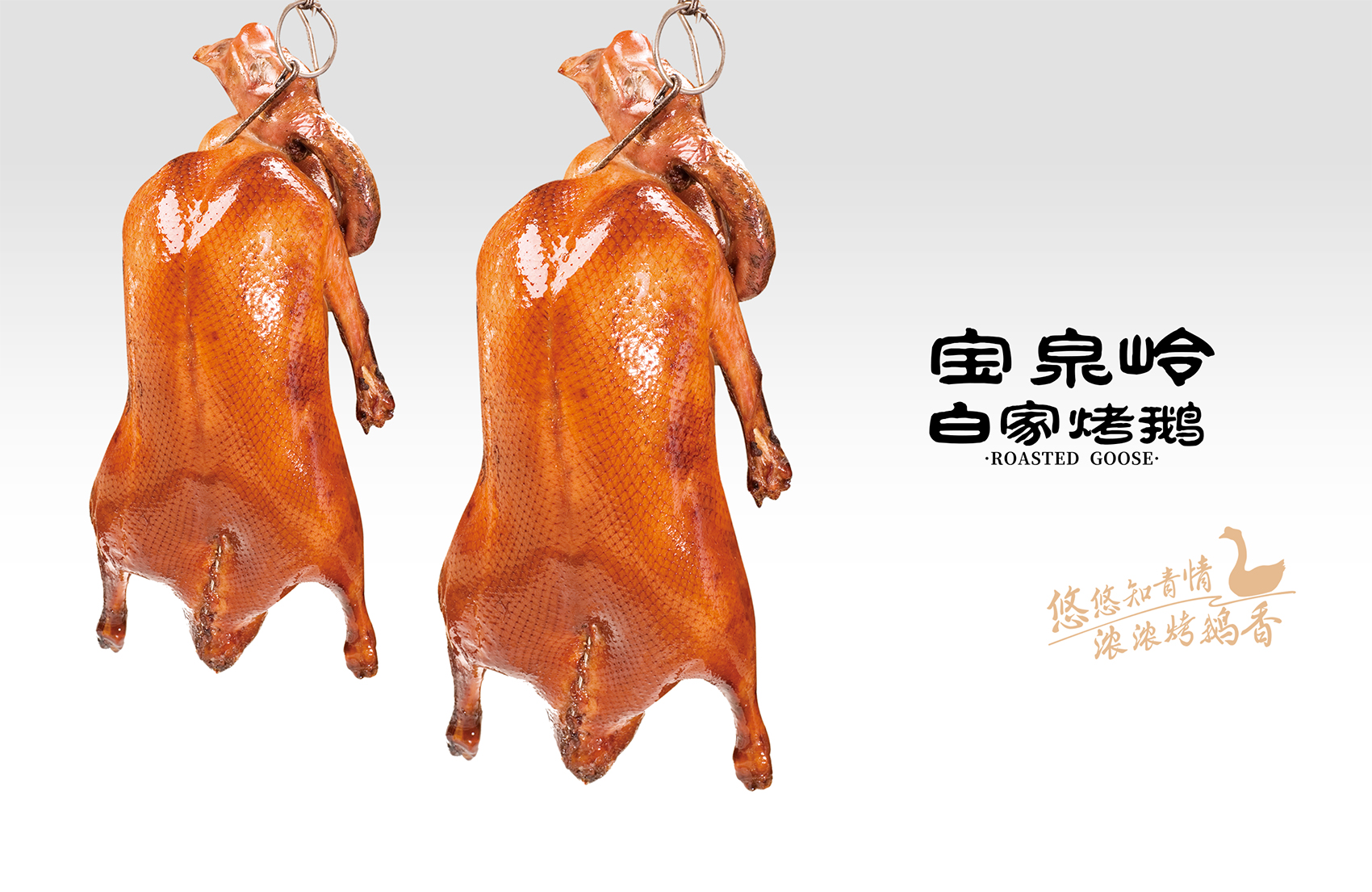 以真實形象示人代表敢為產品與品牌負責,白家烤鵝的LOGO選擇以創始人的照片進行注冊本身就代表了一種承諾,結合知青群體的審美,繽策將“寶泉嶺白家烤鵝”與標志組合成一個喜慶的中式春聯的吉祥圖案,通過中式春聯的傳統符號將寶泉嶺白家烤鵝植入到消費者心智,形成喜慶紅火,佳節伴手禮的品牌印象;字體使用原創設計字體,參考傳統隸書的書法風格,方勁古拙,厚重可靠,其中的“嶺”字右半部分經過整合,形似“合”字代表了品牌對于消費者的美好祝愿與對于烤鵝事業的不懈努力的目標愿景。