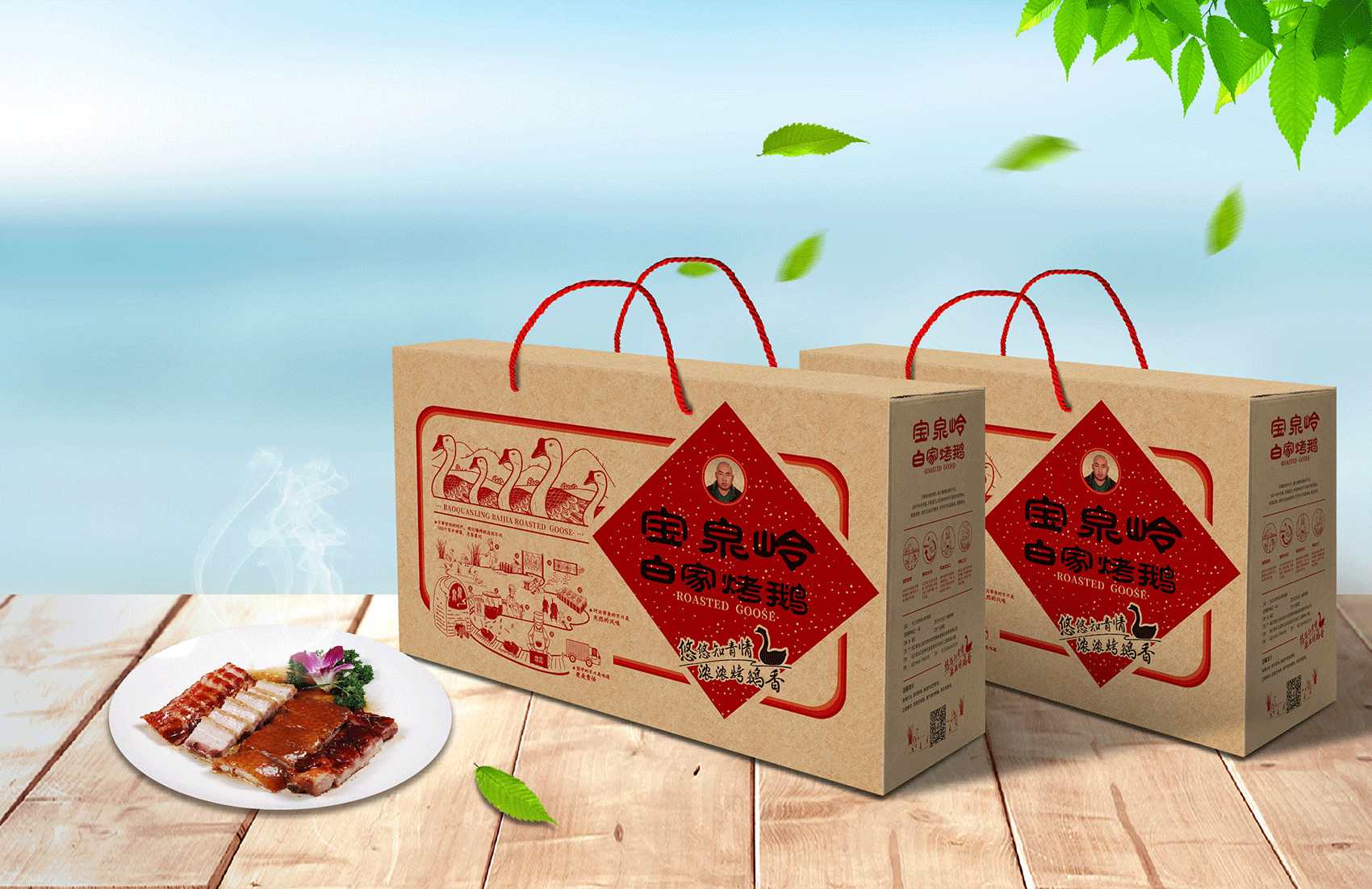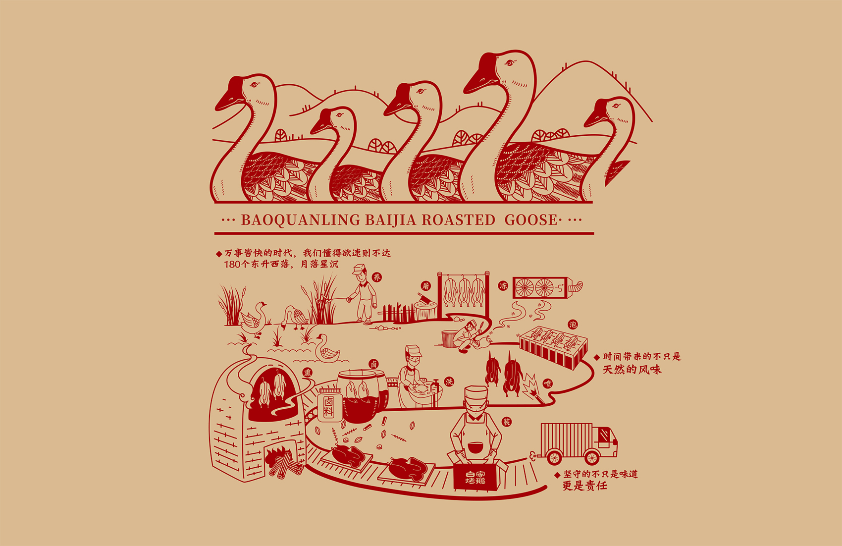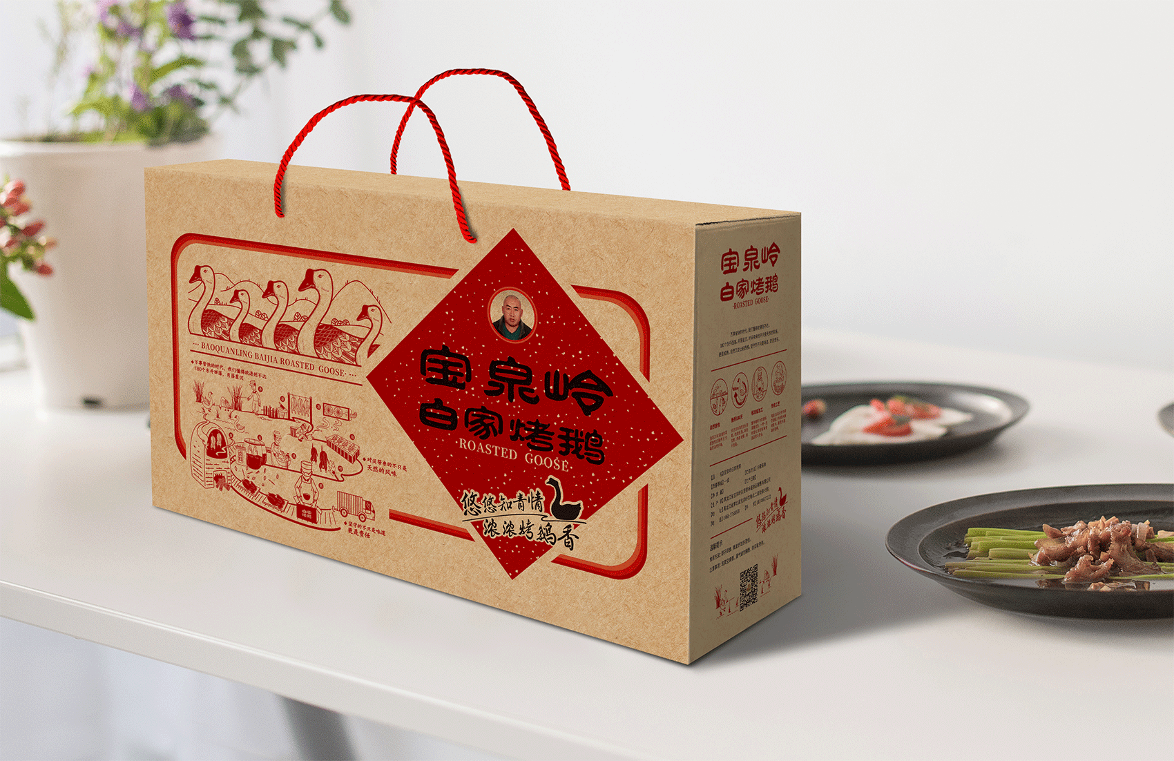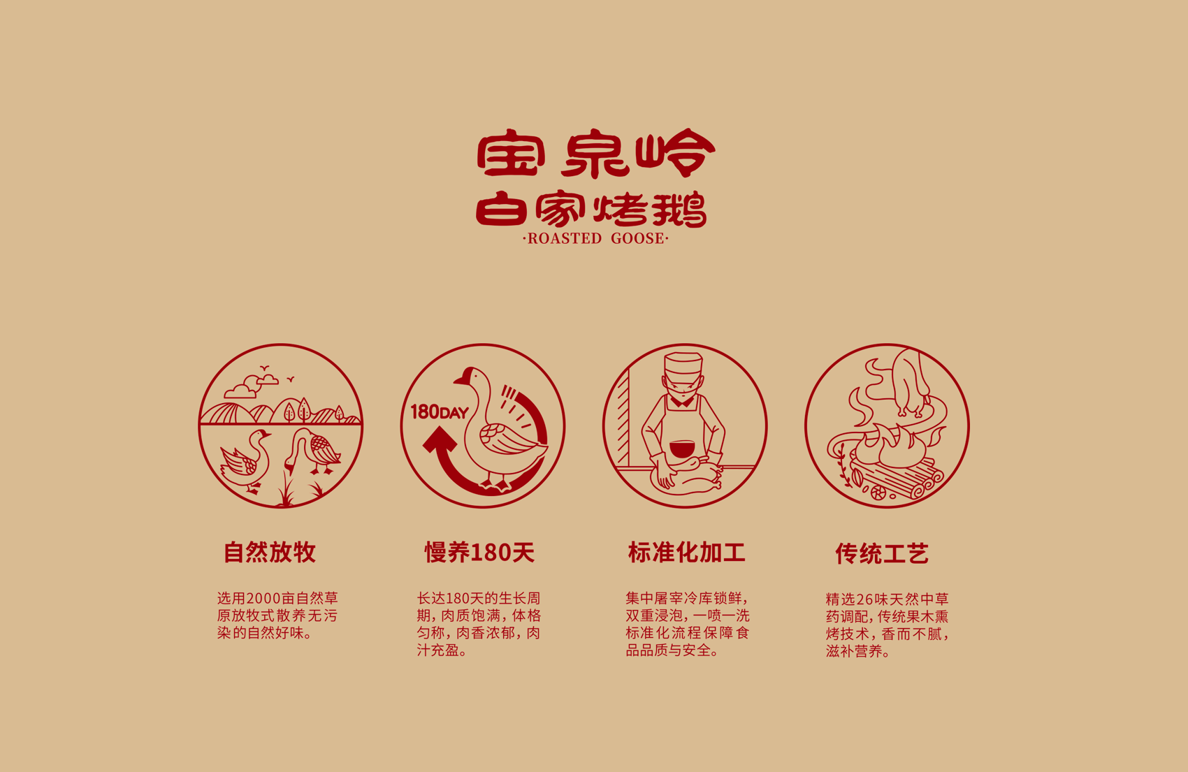 以真實形象示人代表敢為產品與品牌負責,白家烤鵝的LOGO選擇以創始人的照片進行注冊本身就代表了一種承諾,結合知青群體的審美,繽策將“寶泉嶺白家烤鵝”與標志組合成一個喜慶的中式春聯的吉祥圖案,通過中式春聯的傳統符號將寶泉嶺白家烤鵝植入到消費者心智,形成喜慶紅火,佳節伴手禮的品牌印象;字體使用原創設計字體,參考傳統隸書的書法風格,方勁古拙,厚重可靠,其中的“嶺”字右半部分經過整合,形似“合”字代表了品牌對于消費者的美好祝愿與對于烤鵝事業的不懈努力的目標愿景。