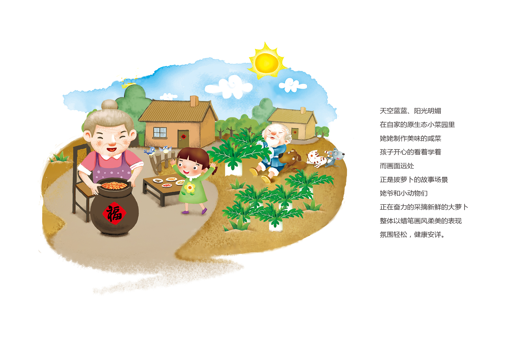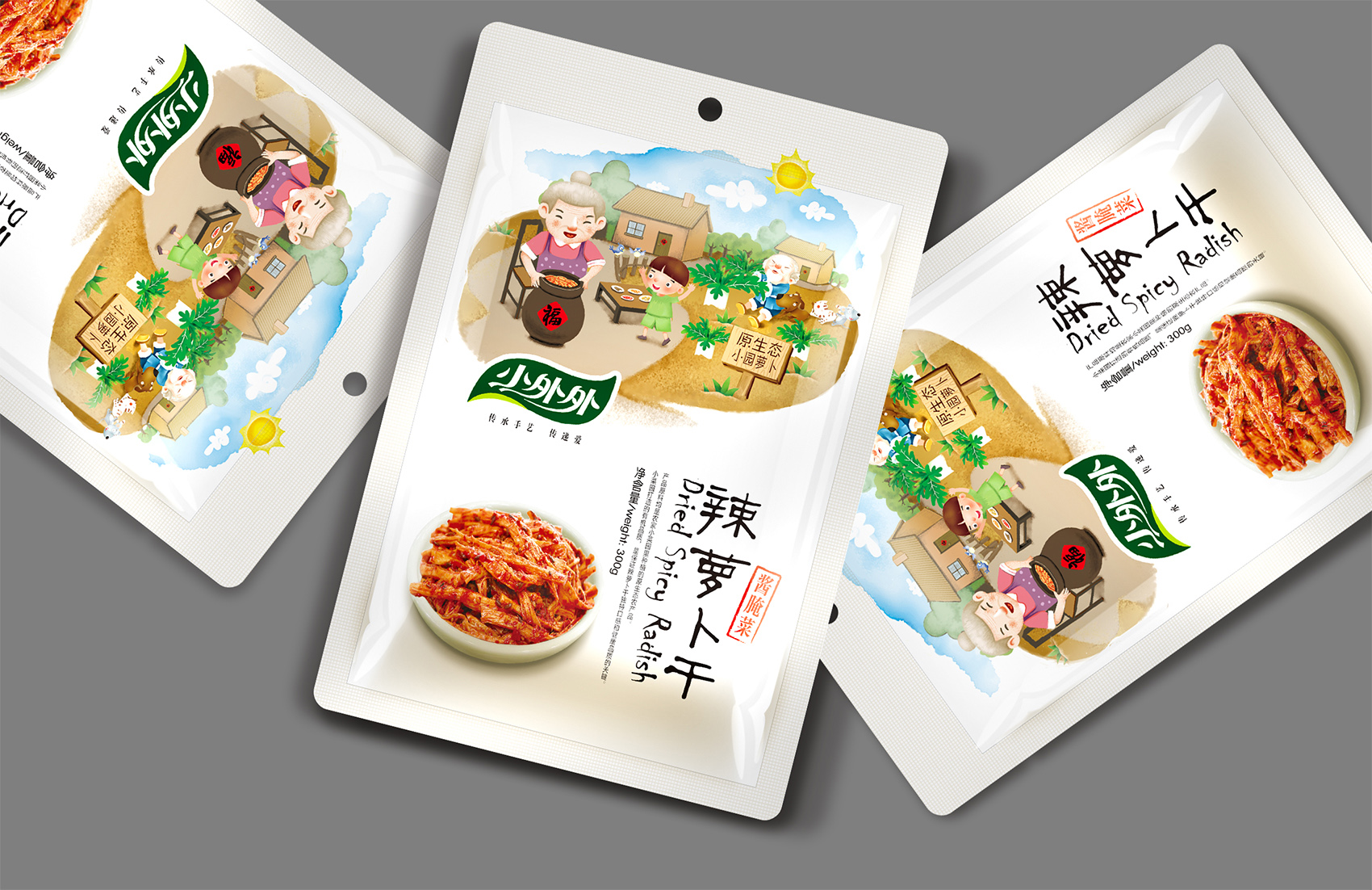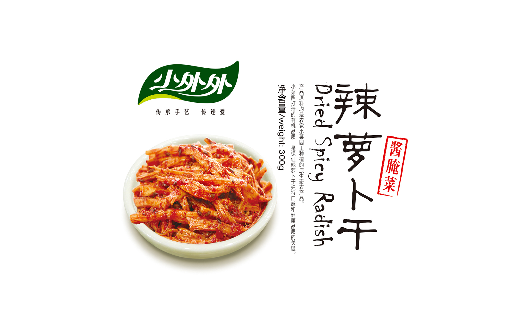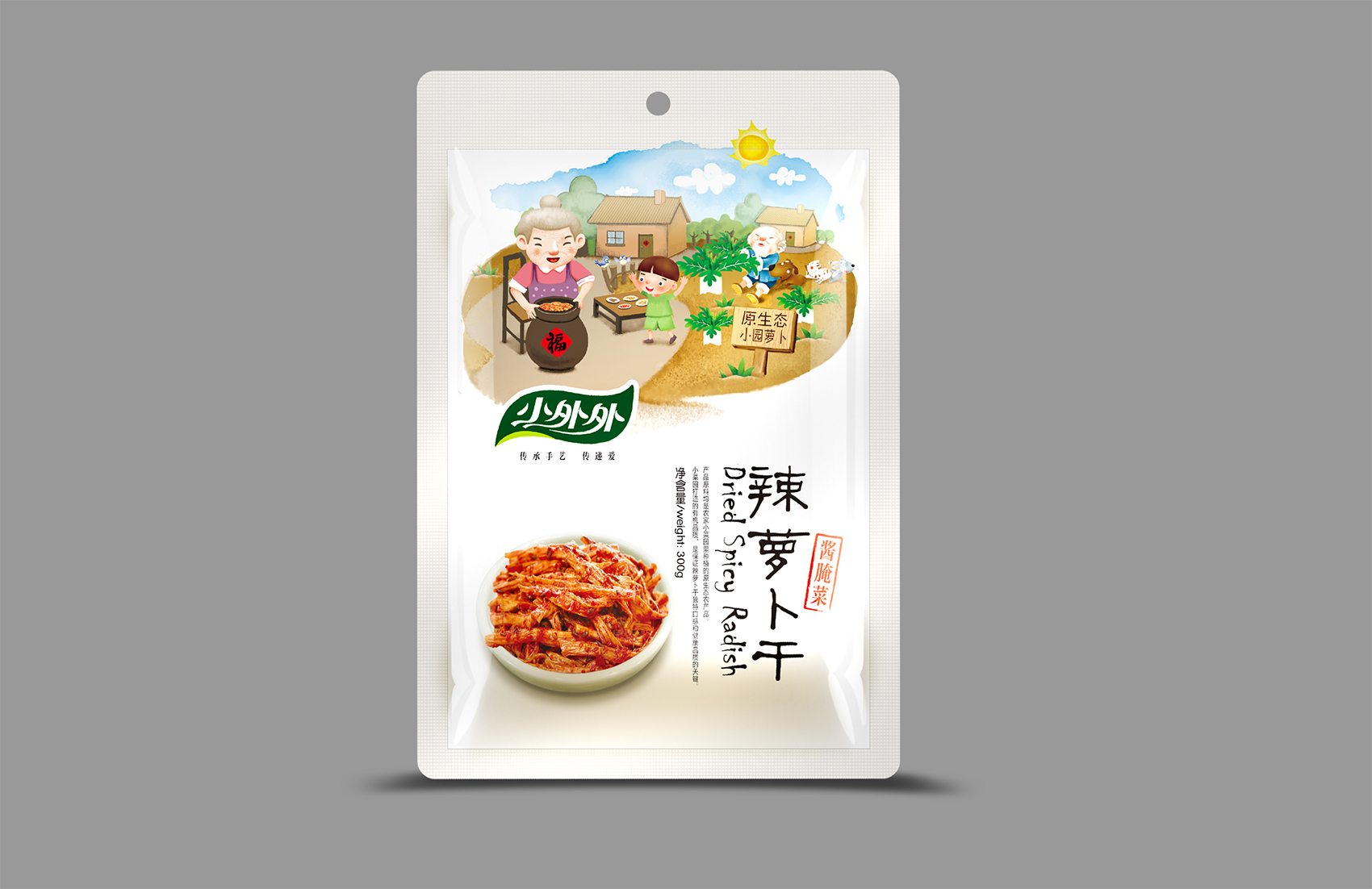 繽策根據前期與企業方的溝通和深入了解,以及對市場訴求的敏銳,對企業方持有的“小外外”進行了品牌優化和升級。同時提煉出“傳承手藝,傳承愛”的產品核心廣告語,進而傳達產品的核心理念。畫面上的創意構圖為天空藍藍、陽光明媚的農家小菜園,姥姥制作美味的咸菜,孩子開心的觀看學習著,遠處姥爺和小動物們正在拔蘿卜,整體以蠟筆風柔美的表現出氛圍輕松、健康安詳的場景。從情懷的營銷路線上,切入“拔蘿卜”兒歌的畫面,這首家喻戶曉的兒歌,老少皆宜,勾起70-80后回憶兒時的田園時光。正面配上實景的商業攝影圖片,色澤誘人、美味可口,使產品更加直觀的表現出本色特征。