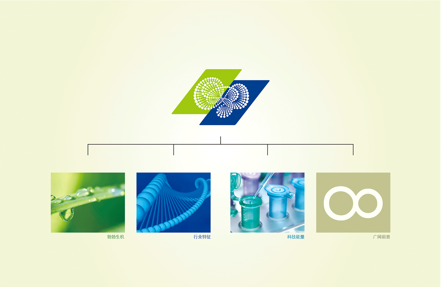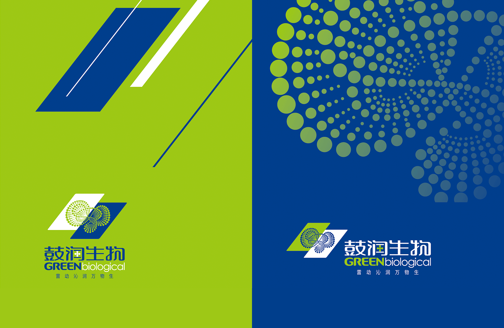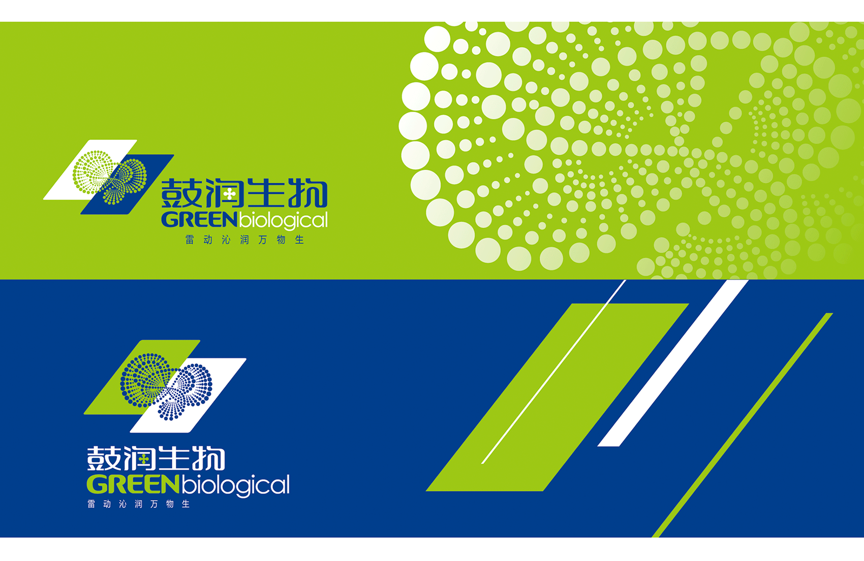 以綠色與藍色色塊為主體,組合成霹靂形狀,將力與美完美地結合一處,以表現“鼓潤”品牌含義,即雷鳴之聲環形繼續了無限能量的生命。圓點紋飾,如明珠般鋪散而出,由大到小漸進式排列,呈現出莫比烏斯環形。體現沁入大地滋養生命,繽紛璀璨的視覺效果,是鼓潤對生命視如珍寶、充滿感恩的經營態度,與無限發展的愿景。并形成品牌標準色、輔助色,品牌專用中、英文字體,輔助圖形等VIS(品牌形象視覺識別系統)基礎元素。