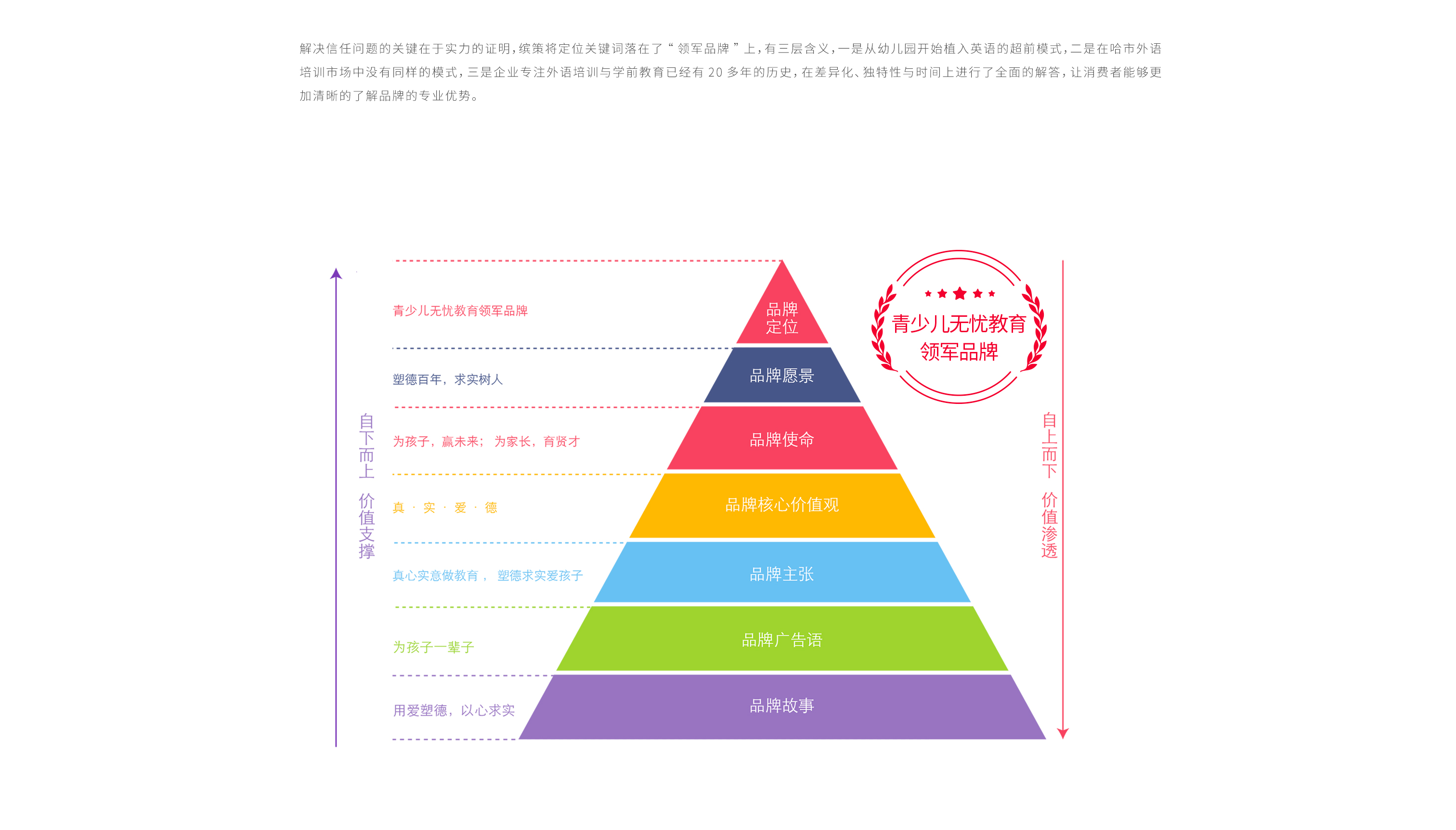 教育行業屬于剛需市場,貫穿著從學齡前至本科及以上,其重要性不言而喻,而其特殊性在于消費決策者與消費體驗者的錯位,即選擇教育品牌的往往是家長,而上課的則是孩子,所以教育品牌面對的是家長與孩子作為整體家庭的消費者,塑徳求實的產品線涇渭分明的同時,又有其關聯,在體驗完幼兒園產品線的消費者往往也同樣會繼續選擇英語產品線,所以在定位上既要概括這兩種不同的目標客群,同時也要明確企業的優勢項目——少兒教育,并在品牌文化中融入獨特性——塑徳求實對于孩子們的愛,經過二十余家競品市場調研以及多次座談,繽策以青少兒無憂教育為定位,將愛孩子一輩子的品牌核心構筑整體文化,以標志性費老師個人IP為超級符號,全面建設塑徳求實品牌。